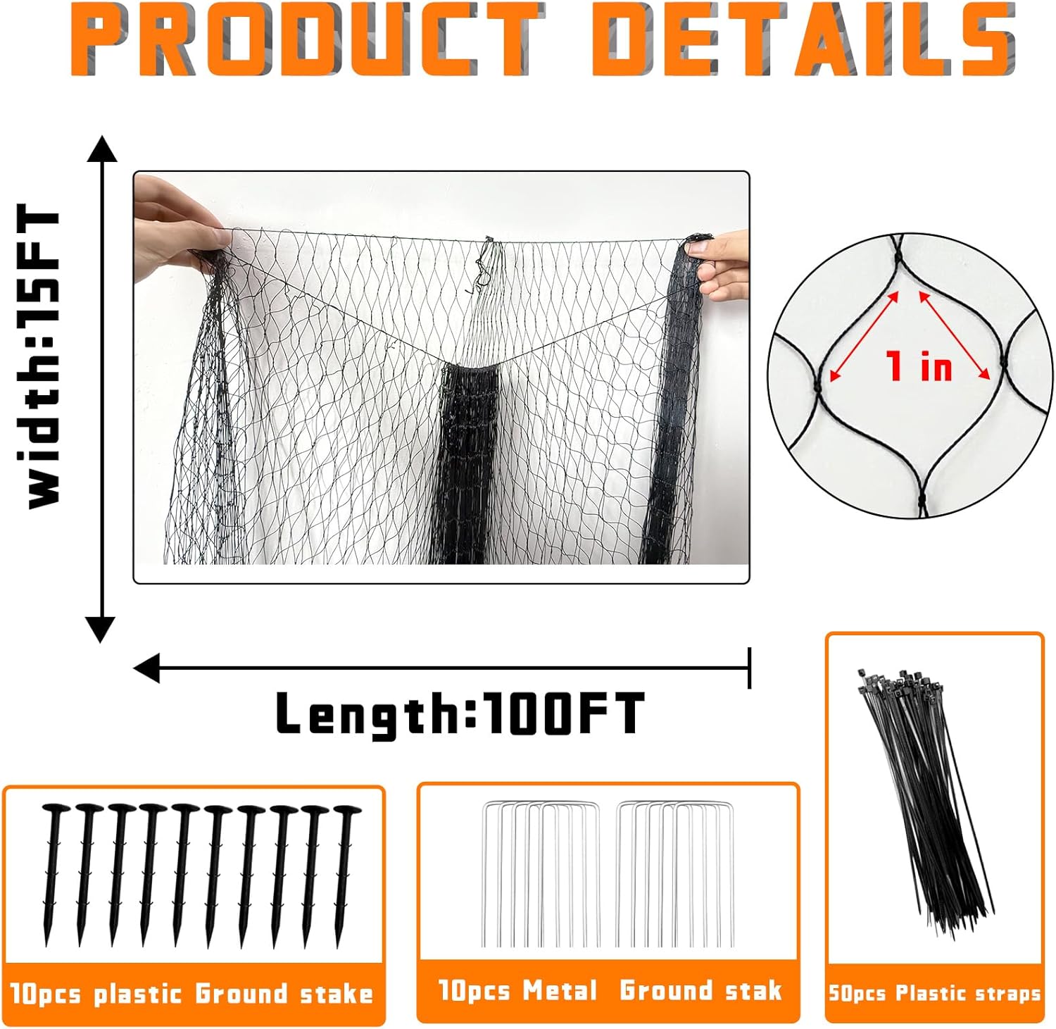 - Bird Netting Kit: Bird netting is available in different sizes, you can combine it with your needs before buying. The 1 inch diamond mesh provides optimal ventilation and light for plants while effectively blocking birds, hawks, and other animals. 10pcs plastic bround stake, 10pcs metal bround stak, 50pcs plastic straps, complete set