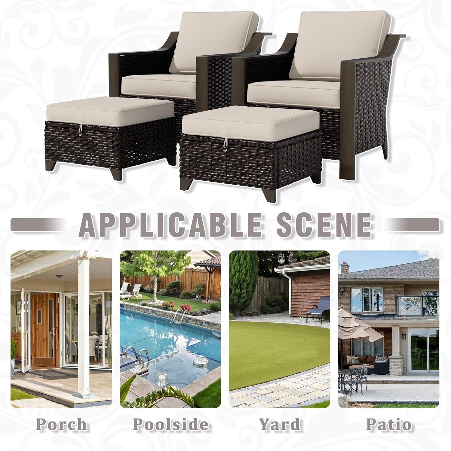 4 Piece Wicker Patio Conversation Set, All-Weather Use Outdoor 2 PE Rattan Chair, 2 Ottoman, Removable Water-Resistant Cushion, Ideal for Porch, Backyard, Balcony, Poolside, Beige