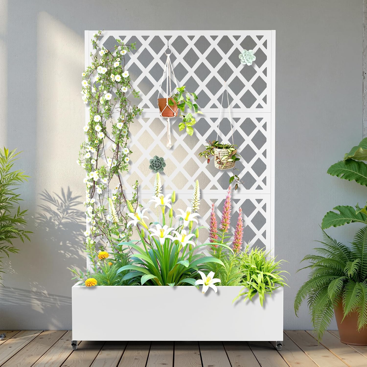 - Space-Saving Design: The planter box is combined with the trellis to provide a space-saving and aesthetically pleasing gardening solution. The vertical design of the trellis maximizes the planting area while maintaining a compact footprint. The outdoor raised garden bed’s vertical design is ideal for people with limited space to build a beautiful garden on a terrace or in a small yard.