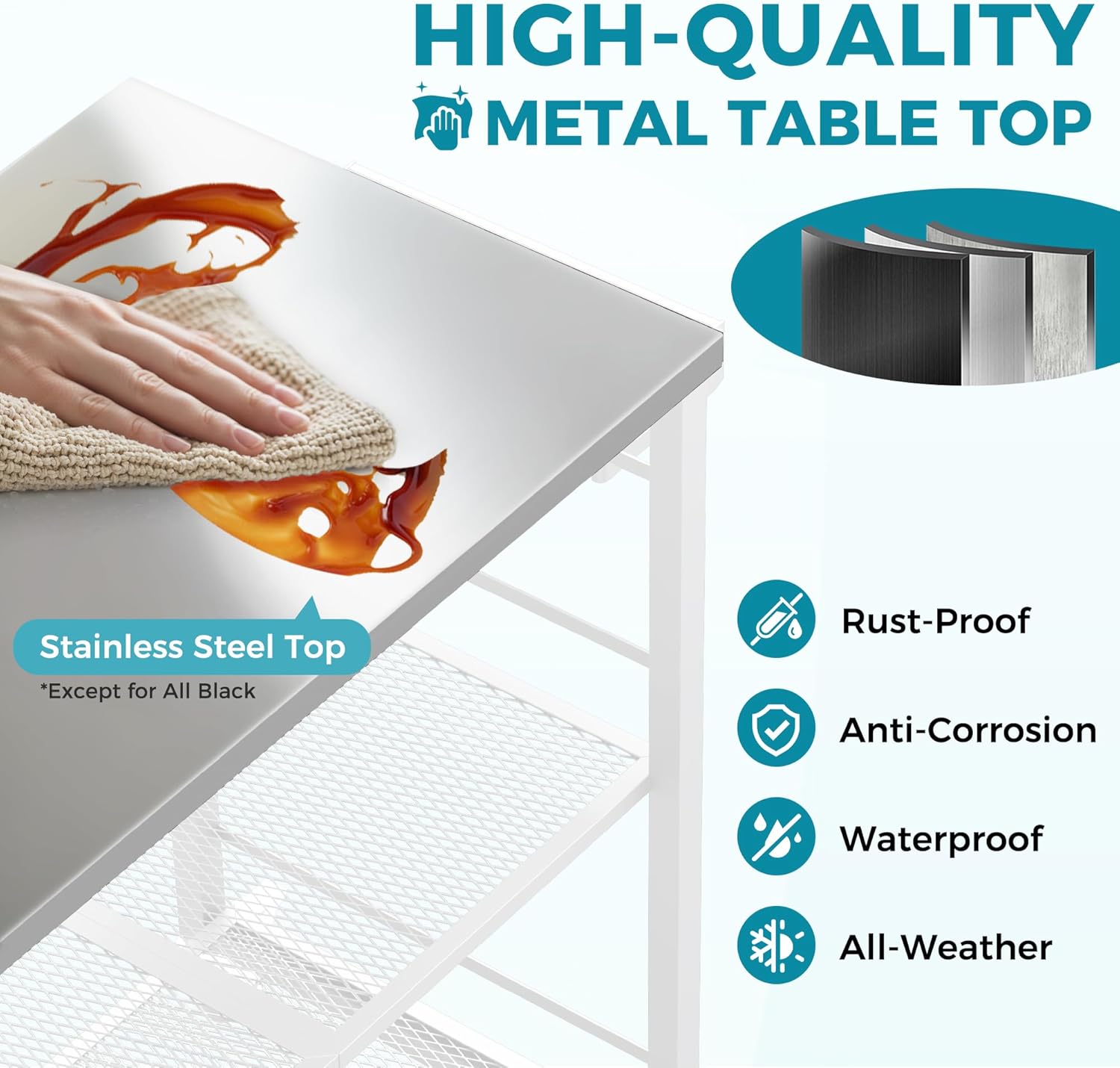 - 【Stable and Sturdy】The grill cart features a reinforced support frame with a secure locking mechanism that prevents wobbling. Confidently hold up to 45 lbs per tier. The rust-proof stainless steel top and metal mesh panels ensure lasting durability. Two of the wheels include a locking function to keep the cart securely in place, even on slopes