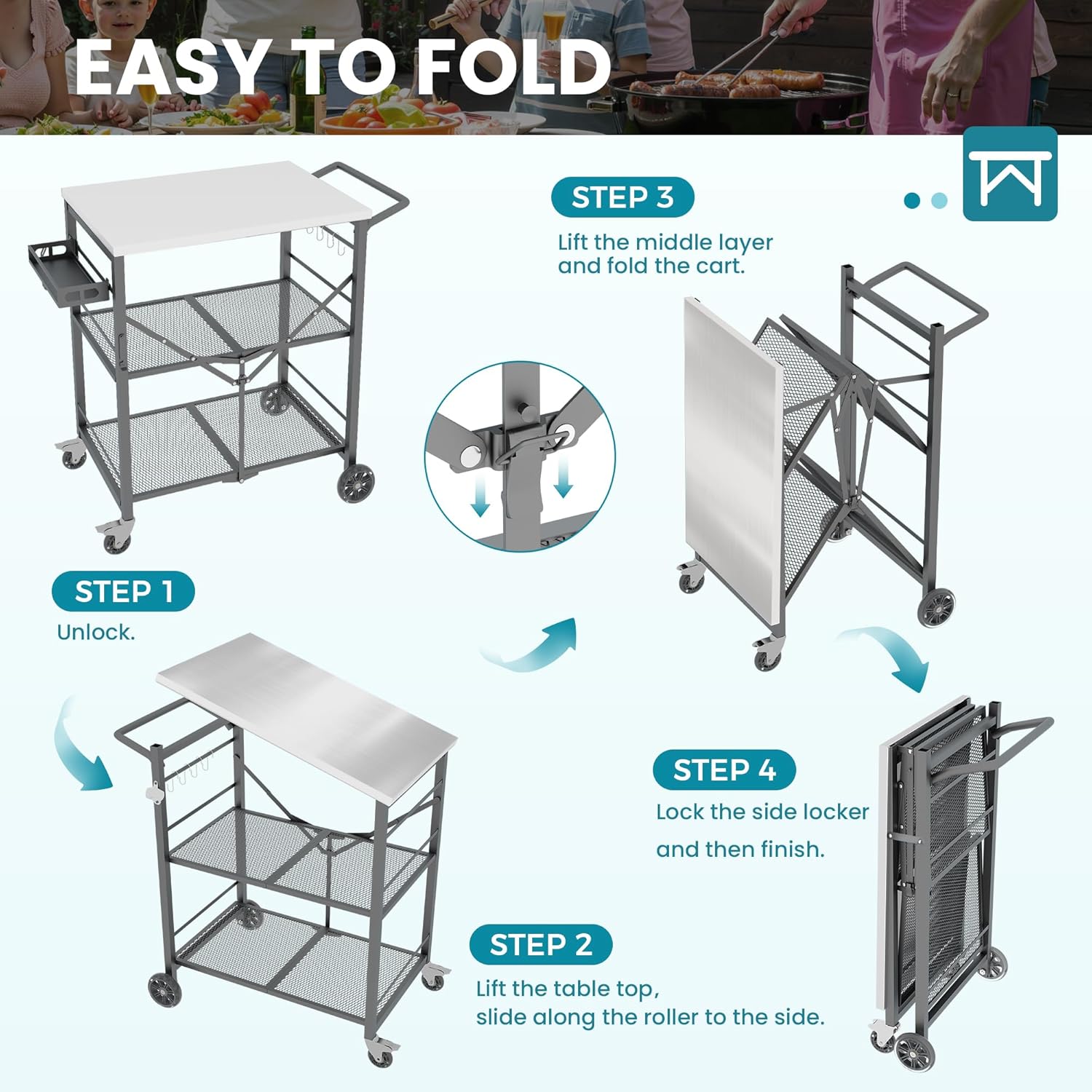 - 【Portable and Foldable】This foldable grill cart can be fully unfolded in just 20 seconds, offering ample room for all your cooking necessities. When not in use, it folds compactly for storage in narrow spaces like closets or car trunks, making it ideal for small patios, kitchens, or on-the-go adventures