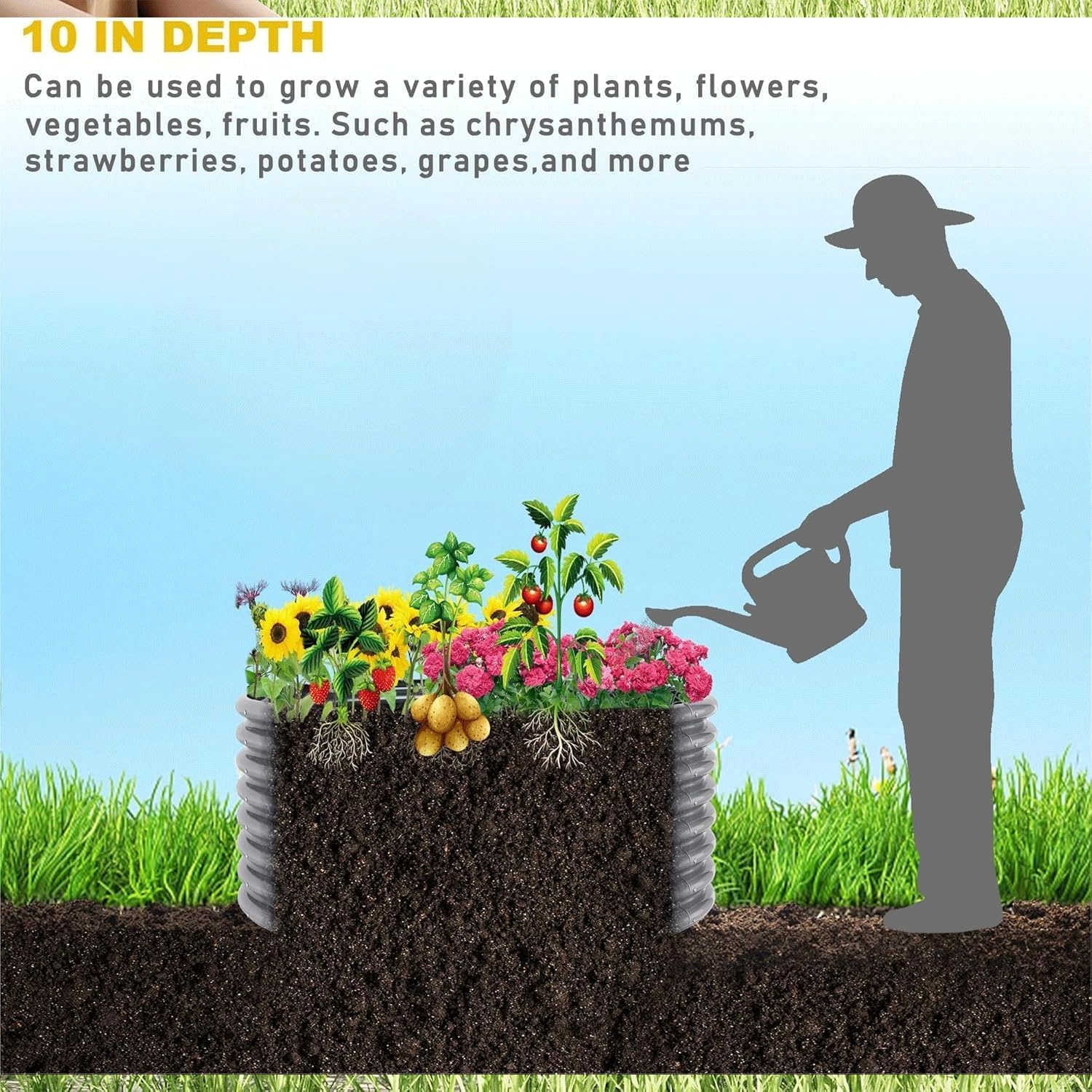 - 【Durable Galvanized Steel Construction】:Crafted with high-quality galvanized steel, this metal raised garden bed is built to last. The anti-corrosion coating ensures long-term durability, while the sturdy structure withstands heavy soil and weather conditions, making it perfect for outdoor use. Unlike traditional wooden garden beds, it resists warping and rotting over time.