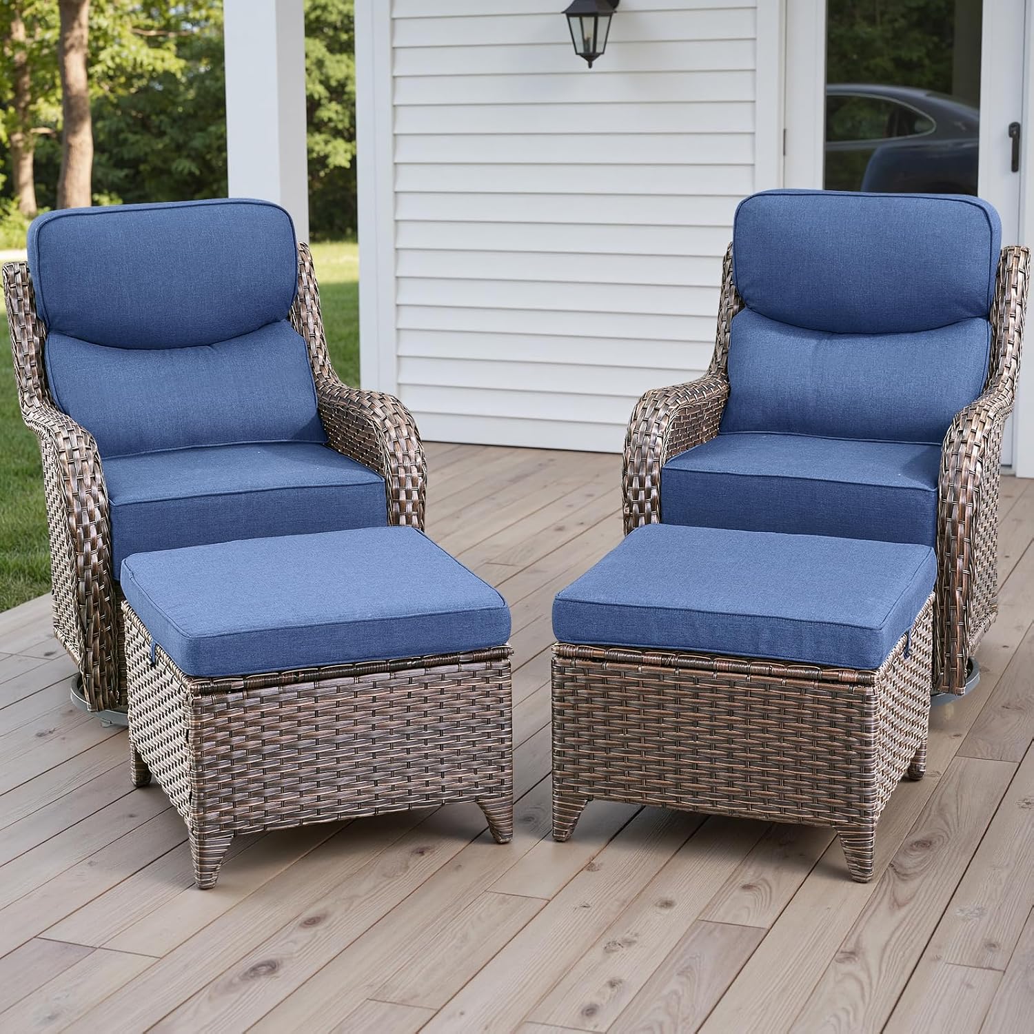 Wicker Outdoor Patio Furniture Set - 4 Piece Patio Conversation Set with Swivel Rocker Chairs and Ottomans, 6 inch Cushions, High Back, Deep Seating, for Porch Deck Garden Brown/Blue