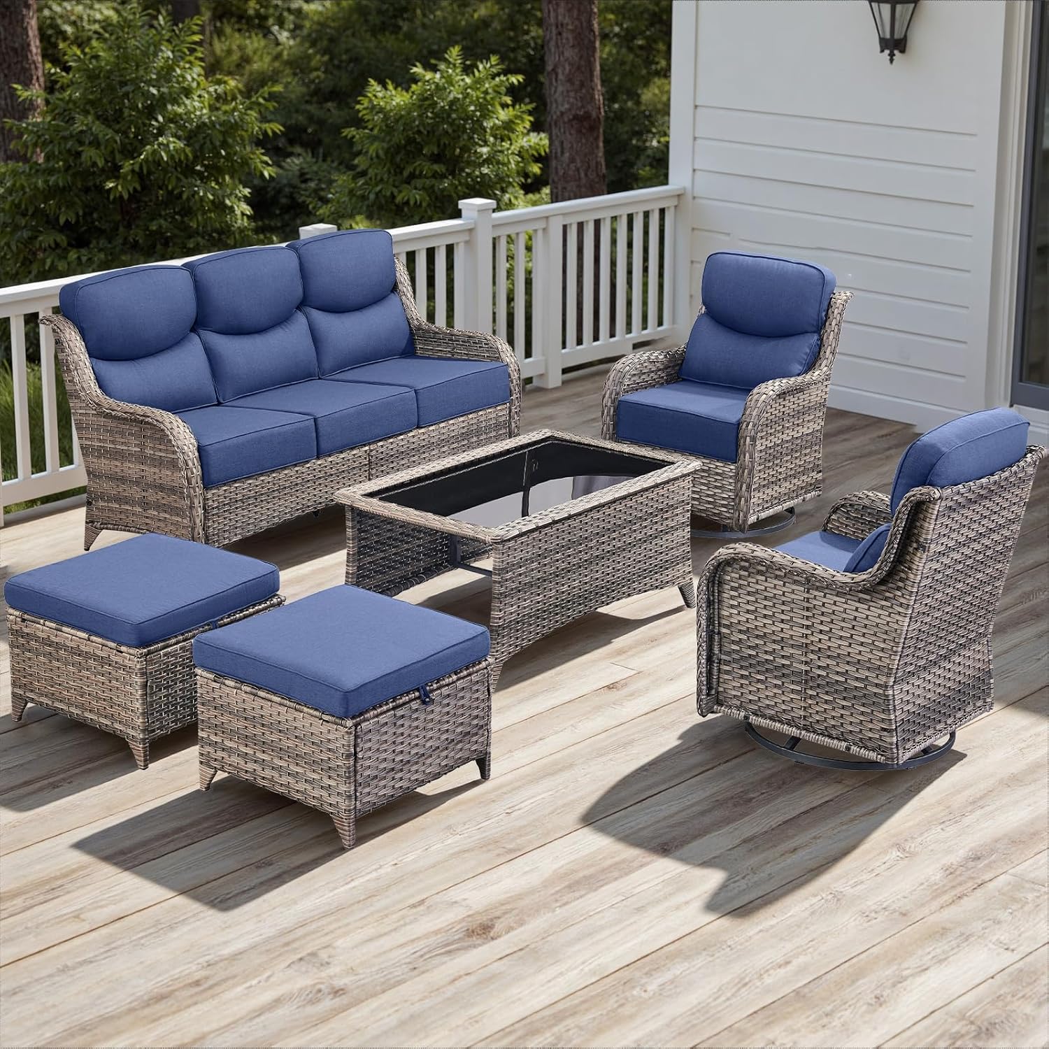 Wicker Outdoor Patio Furniture Set - 6 Piece Patio Conversation Sets with Swivel Rocker Chairs, Ottomans, Sofa and Coffee Table, 6 inch Cushions, Deep Seating, for Porch Deck Mixed Grey/Blue
