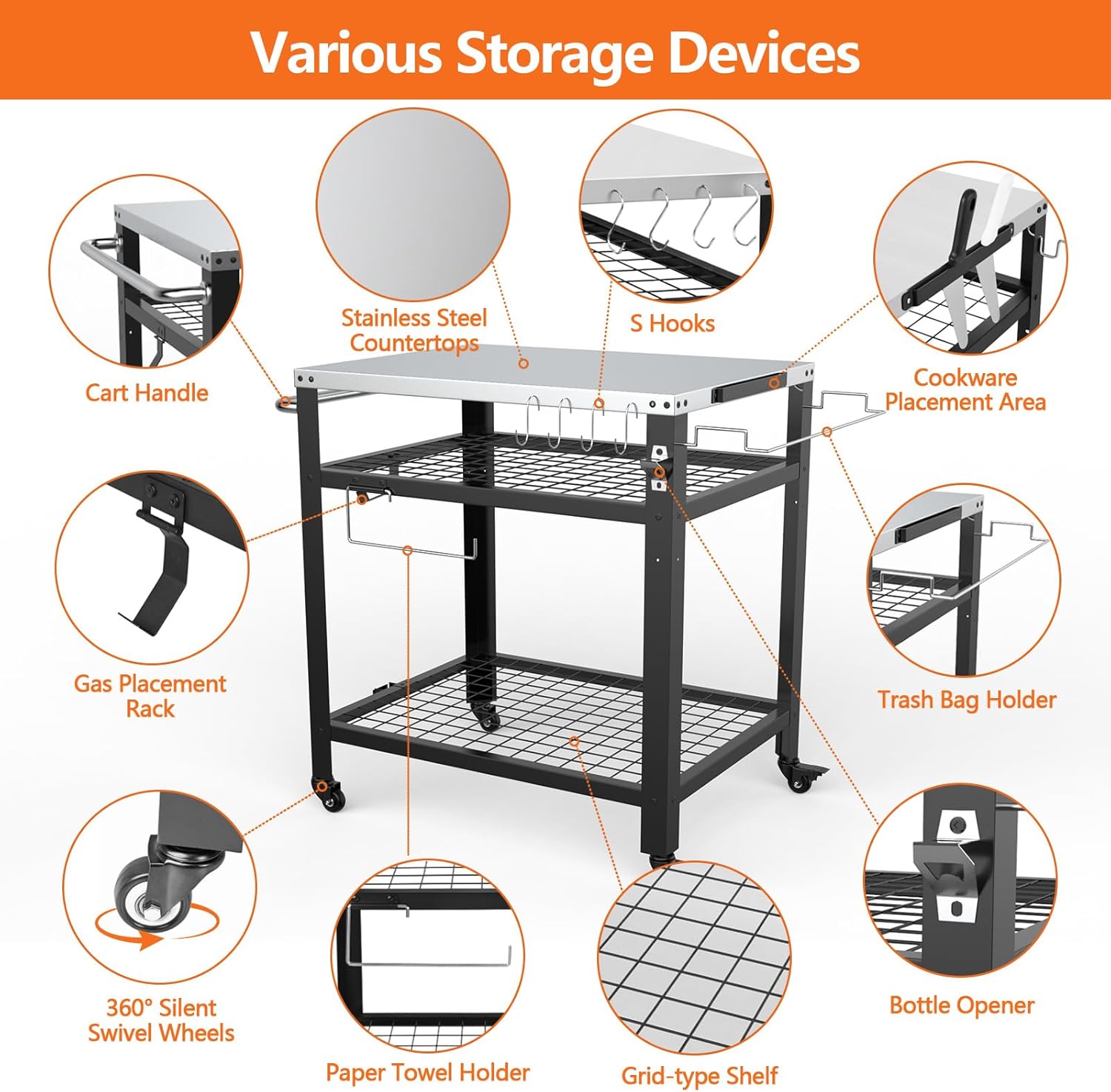 - [Ample Storage Accessories, Well Organized]: The outdoor prep table provides a rich variety of storage accessories, including paper towel holders, cart handles, bottle openers, racks, 10 S-hooks, cookware placement area, garbage bag rack, providing ample storage space for your cooking tools and kitchen items