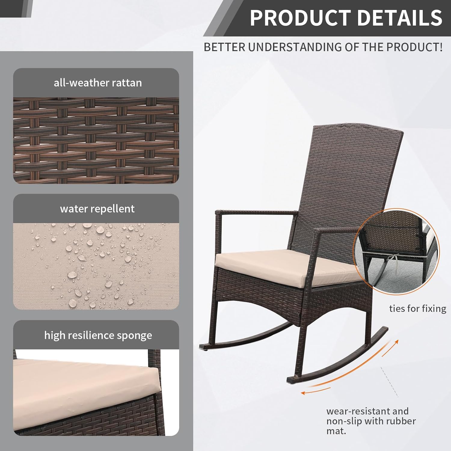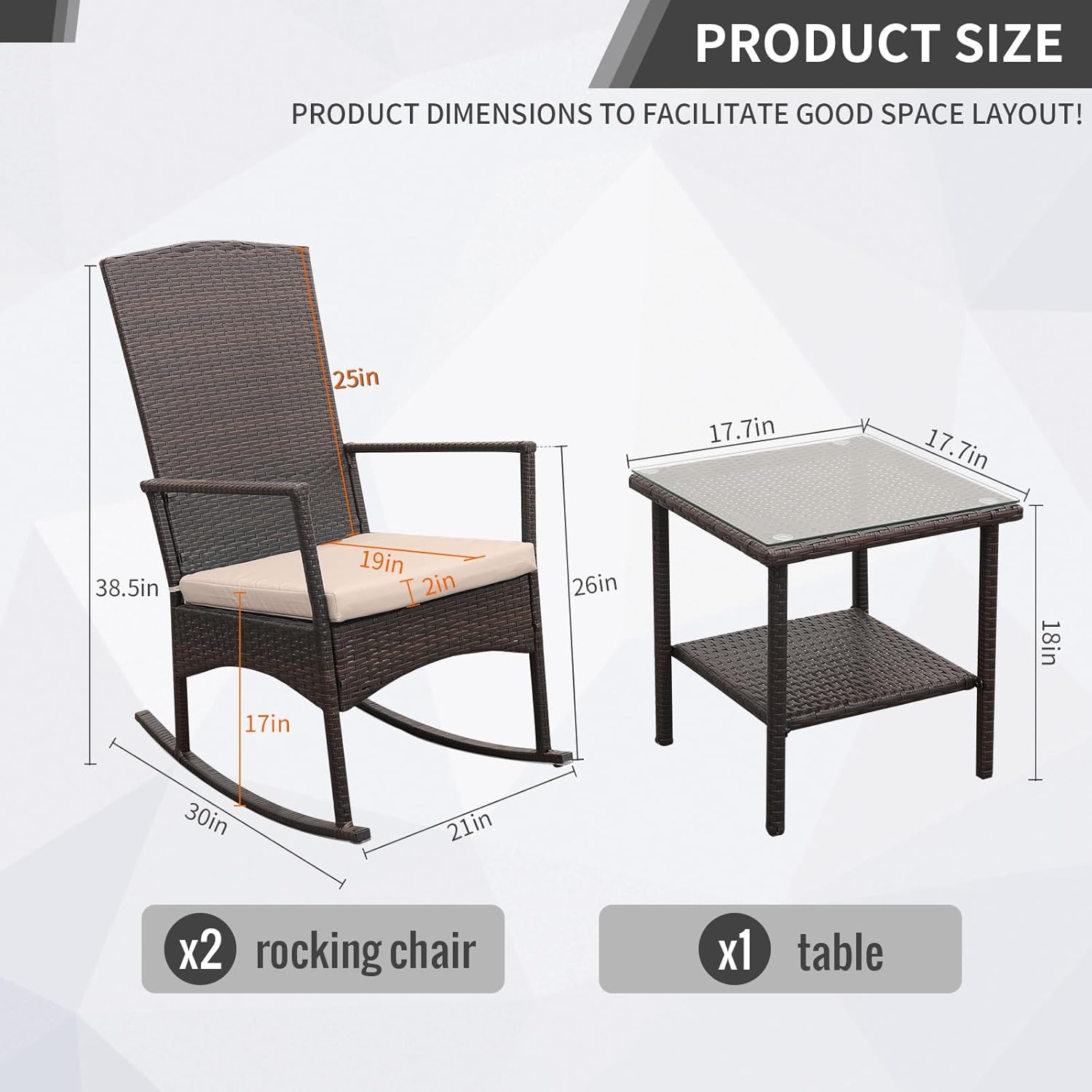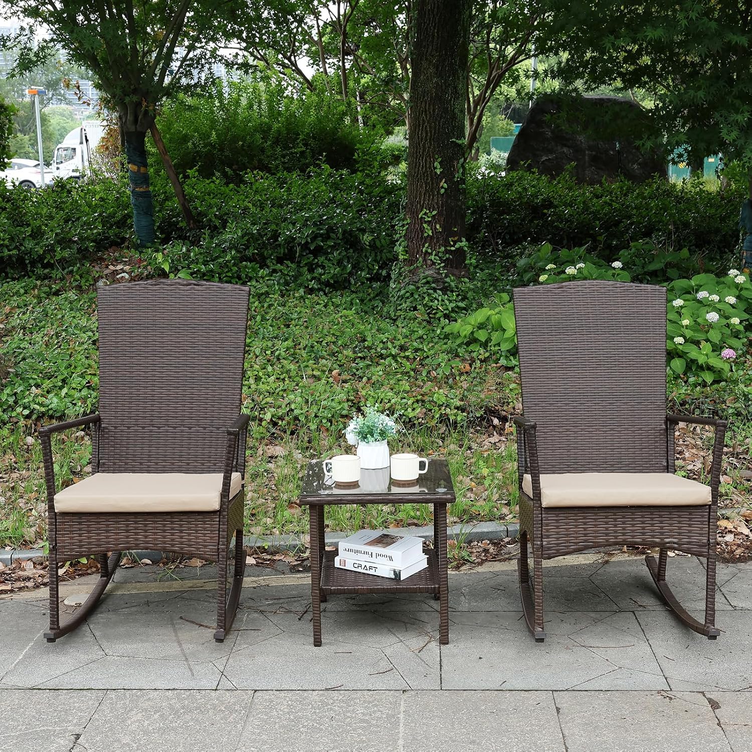 - Quality & Maintain: Delicate composite weaving with half-moon all-weather HDPE wicker material handwoven over fully-welded powder-coated steel framing makes the outdoor rocking chair 3 Pcs durable and sturdy. Breathable 250G polyester anti-UV and water-repellent fabric. Each piece is designed to withstand sunshine beating down and rainstorms rolling through.