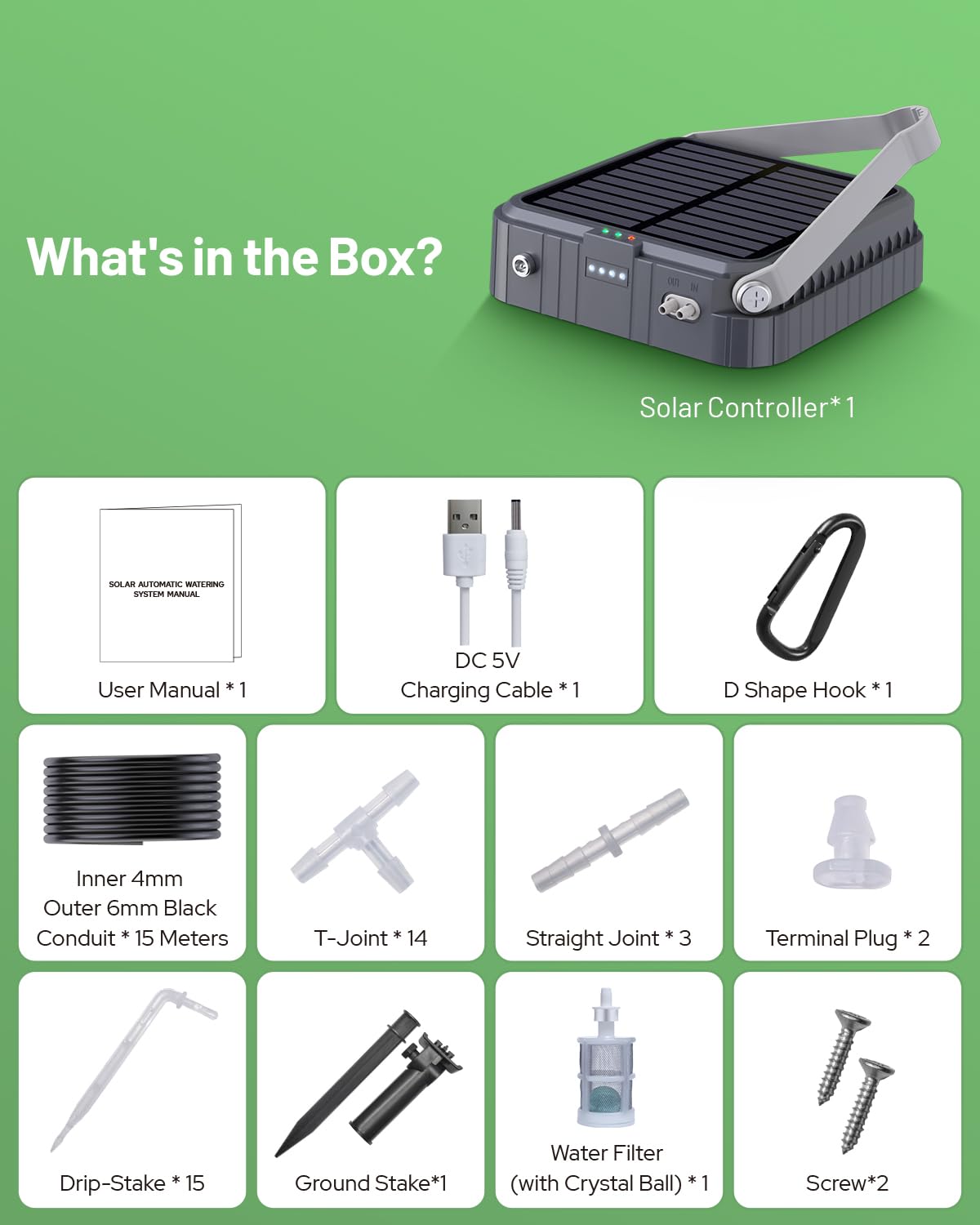 - 🌻Effortless Watering Solution🌻 Our automatic watering system offers three placement options, perfect for balconies, terraces, and small gardens lacking access to a faucet or fixed power source. ✅No Worry for Power Supply✅ Equipped with visual battery indicators, the system can be charged via external power when solar energy is insufficient. Its high-capacity battery ensures up to 30 days of consistent watering.