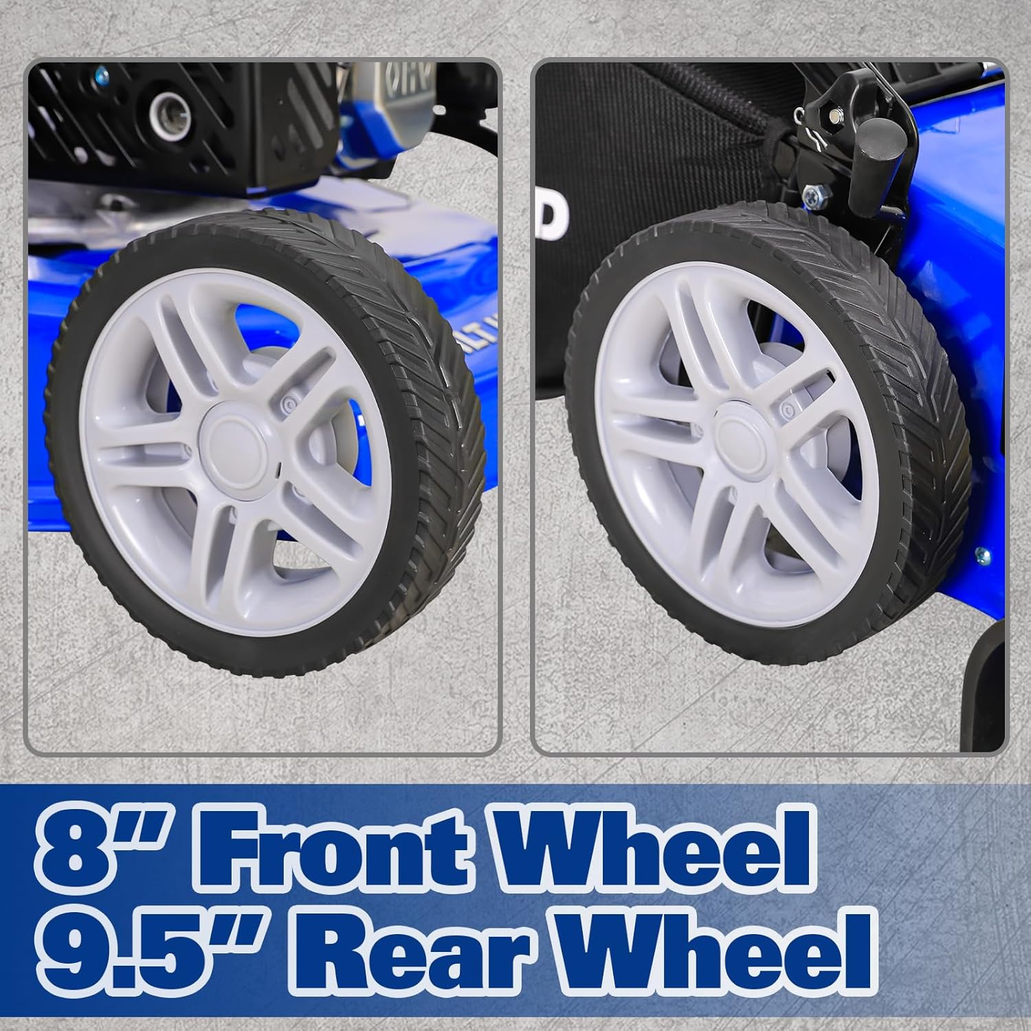 - Effortless Yard Maintenance - Equipped with smooth-rolling 9.5" rear wheels and 8" front wheels, both featuring double ball bearings, the mower moves effortlessly across your yard. The comfortable foam-wrapped, angled handle reduces hand fatigue, making lawn maintenance a breeze.