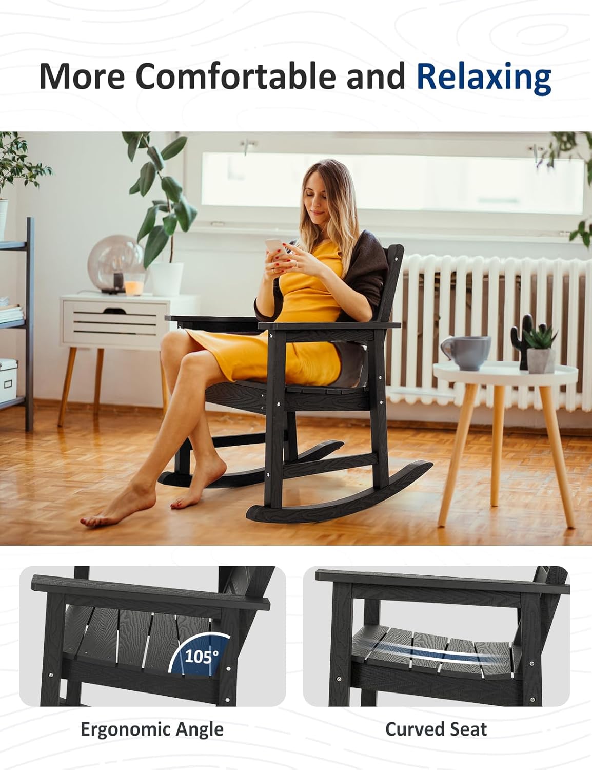 Patio Rocking Chair, Weatherproof HIPS Outdoor Rocking Chair for Adults, 400LBS Support Heavy Duty Porch Rocking Chairs for Garden, Lawn, Backyard, Outdoor and Indoor (Black)
