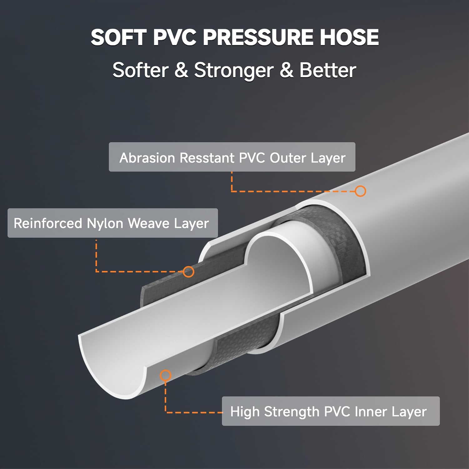 - 100 FT Replaceable Hose: The pressure washer with a 100 ft replaceable hose. Constructed from 3 layers of explosion proof composite material, it remains flexible in extreme temperatures (32 °F-104 °F), so there's no worry of the hose breaking, losing its elasticity or discolouring, and it's designed to tackle even the toughest cleaning jobs.