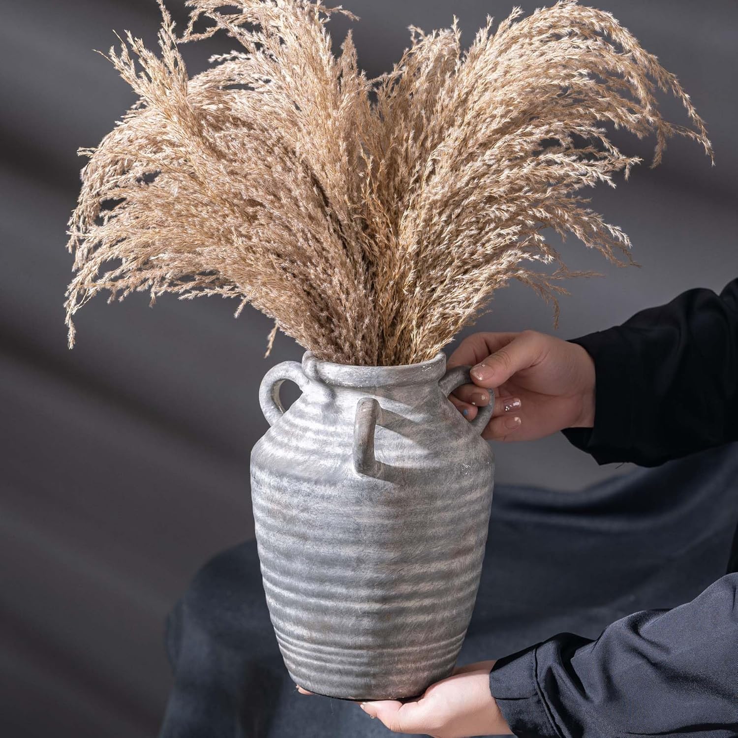 Grey Terracotta Ceramic Vase with Handles, Vintage Rustic Pottery Vases for Table Centerpiece, Cottage Core Home Decor, Large Flower Vases for Bouquet Entryway Mantel Bookshelf Living Room 8.9 Inch