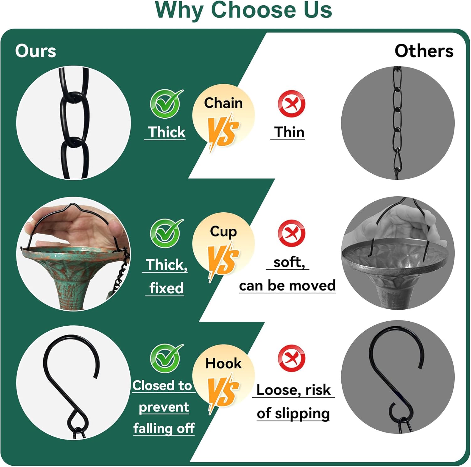 - Improved Stability & Reduced Splashing: Funnels rain chain features a thickened chain, triangular hook, and decorative glass ball for added stability; Each cup has a 0.4" hole and connects with extra links to ensure smooth water flow and reduce splashing