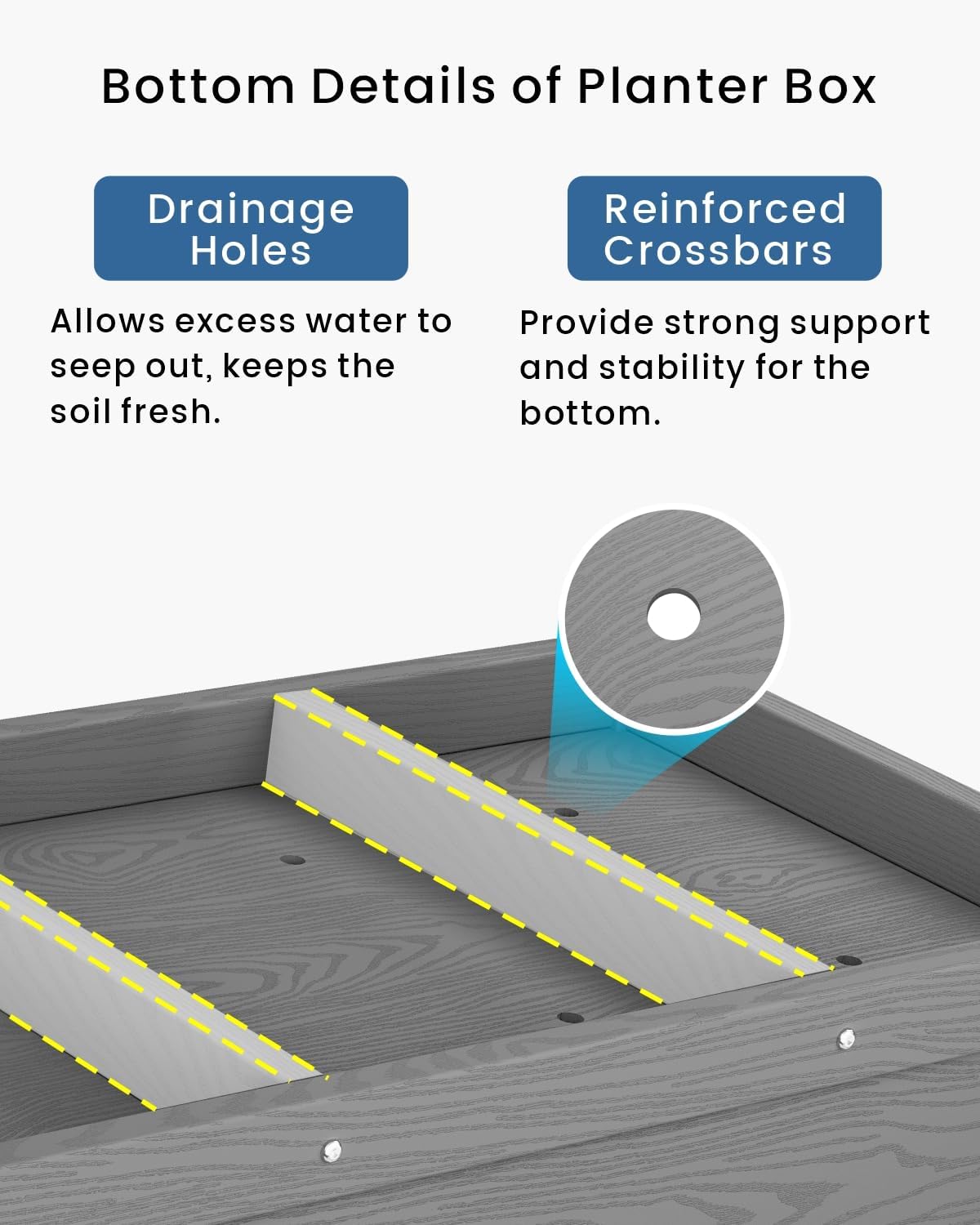 - Drainage System: This planter box is equipped with drainage holes at the bottom to allow excess water to drain out, keeping the soil fresh. Two reinforcing crossbars provide added support, preventing the bottom from detaching.