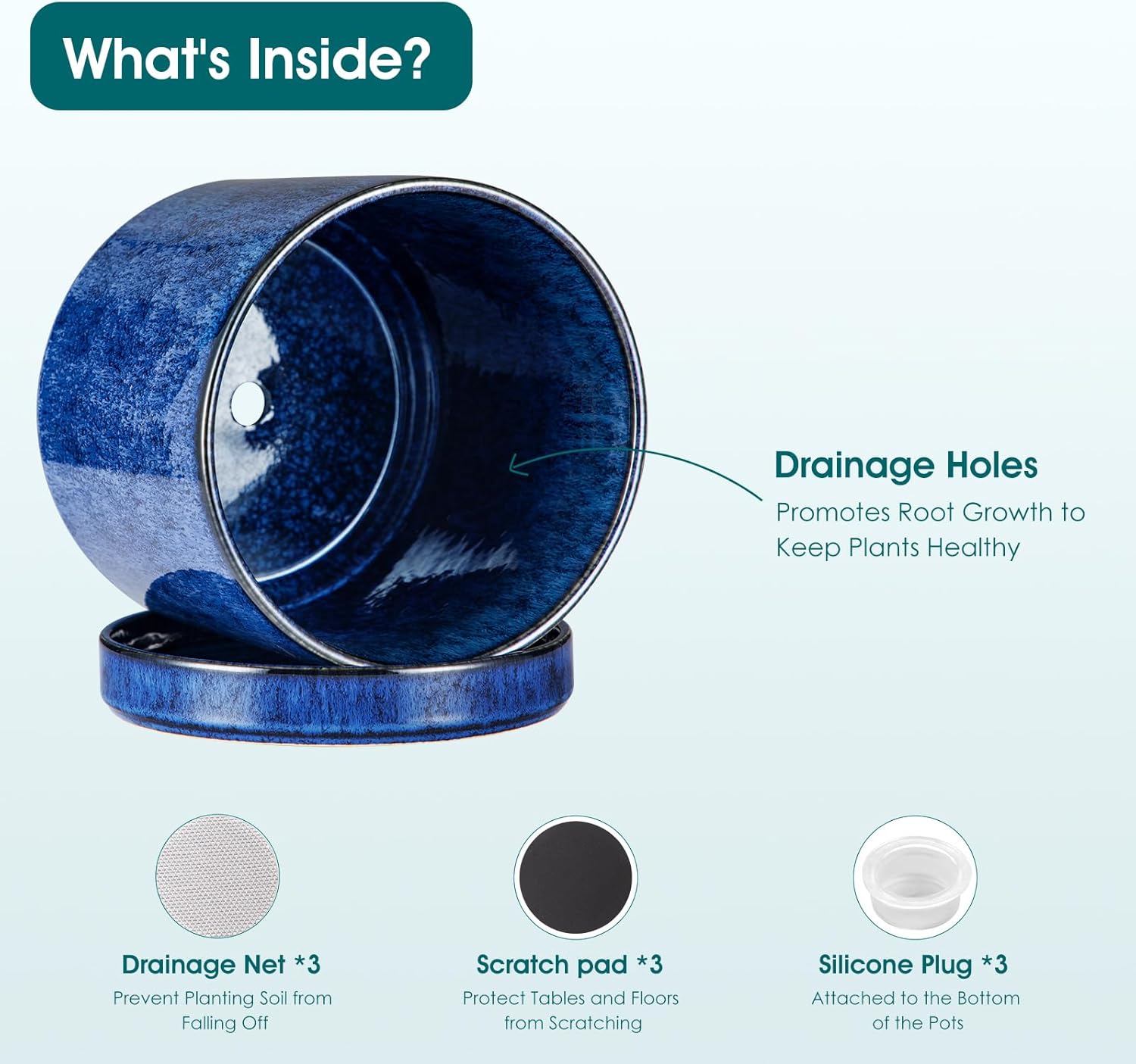 vancasso Ceramic Planters, Plant Pots for Indoor Plants, 6.25+8.25+10.25 Inch Ceramic Pots for Plants, Flower Pots with Drainage Holes (Blue, 6.25+8.25+10.25 Inch)