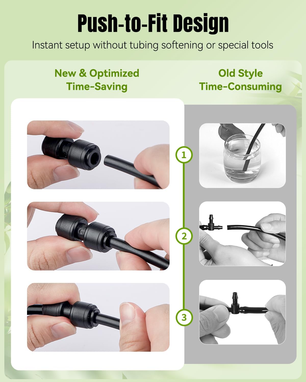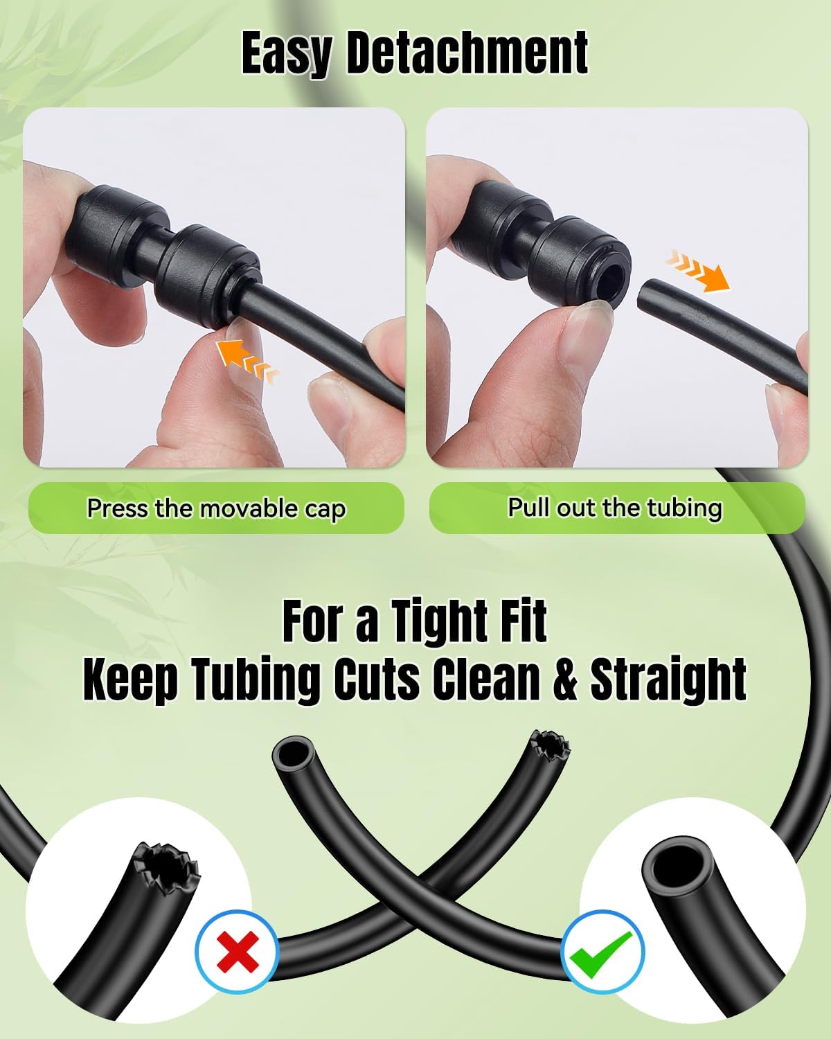 - Push-to-Fit Design: No tubing softening or special tools required! Simply push your tubing into the drip irrigation coupling connectors for an instant setup. To detach, just press the movable caps on the inlets and pull out the tubing