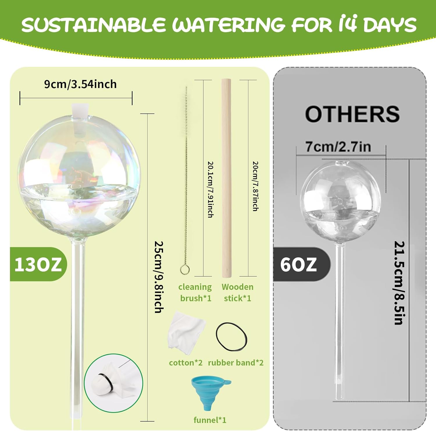 - 💎 Hand-Blown Glass with Rainbow Iridescence Each watering globe is meticulously crafted by skilled artisans, featuring a dazzling rainbow finish that creates mesmerizing light reflections in sunlight – turning your plants into living art.