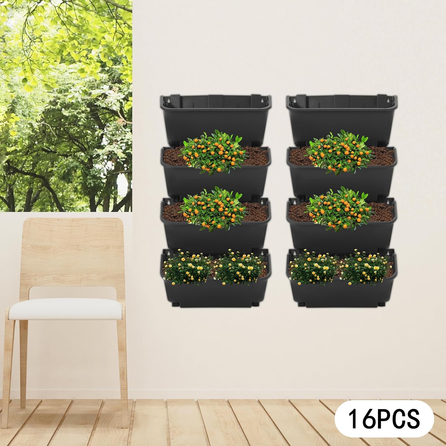 Vertical Wall Planter, Wall-Mounted Living Garden Planter with 16 Plastic Pots Stackable Wall Hanging Flower Pot Clasp Design for Vegetables Flowers (Black 16)