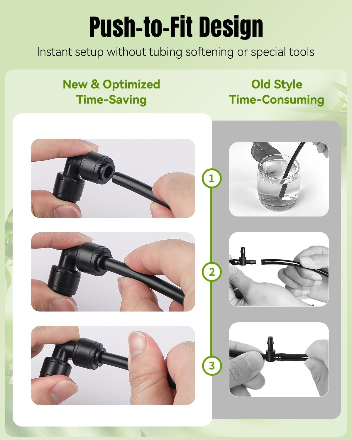 - Push-to-Fit Design: No tubing softening or special tools required! Simply push your tubing into the drip irrigation elbow connectors for an instant setup. To detach, just press the movable caps on the inlets and pull out the tubing