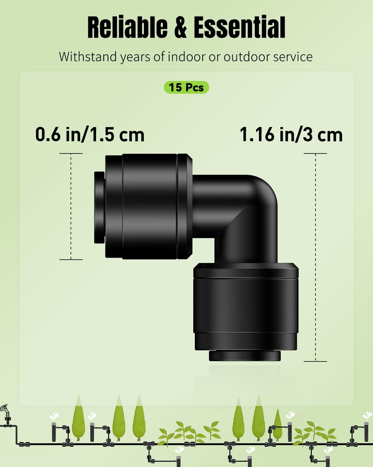 - For All 1/4" Tubing: Universally compatible with all standard 1/4-inch drip irrigation tubing, especially the rigid PE hoses (ID: 0.16''/4 mm; OD: 0.24''/6 mm)! Enjoy customizing or expanding your garden watering network with these elbow fittingsq