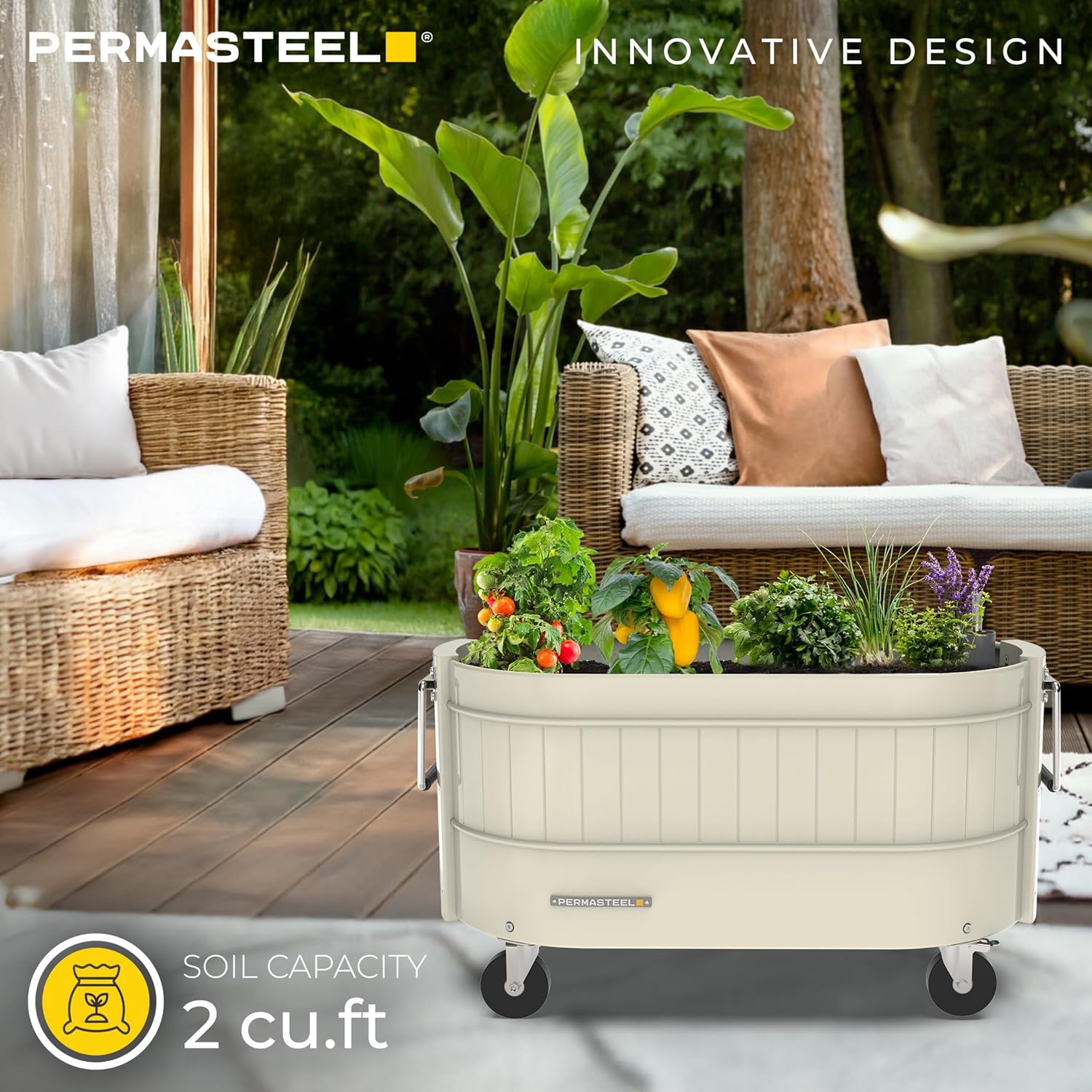 Permasteel Self-Watering Garden Bed, Rolling Planter for Vegetables, Flowers, Herbs, and Fruit, Outdoor Indoor, Caster Wheels, Ivory