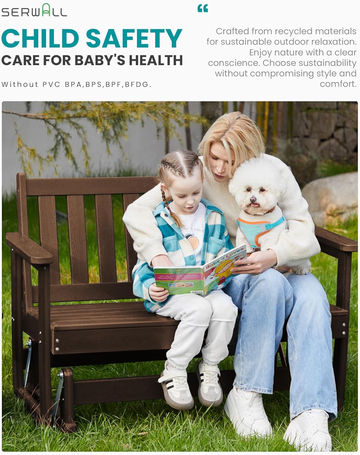 - [Outdoor Comfort] SERWALL outdoor swing chairs feature a unique wood-like texture, adding a touch of natural beauty to your space. Enjoy the fresh air and sunshine in comfort with this outdoor glider bench, create your outdoor relaxation paradise.