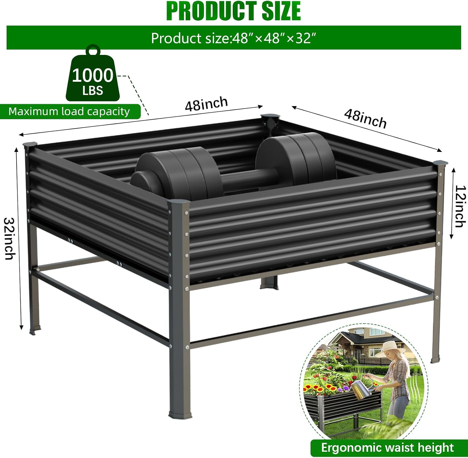- 【Spacious Planting Space】-Our raised garden bed with legs measures 48x48x32 inches, 120 gallons, 1000LB capacity.To enhance safety and prevent any potential discomfort, we've added protective pads to the four corners both above and below the raised garden bed. These pads not only effectively safeguard against sharp corners that may poke individuals but also provide protection for your floors by preventing scratches.
