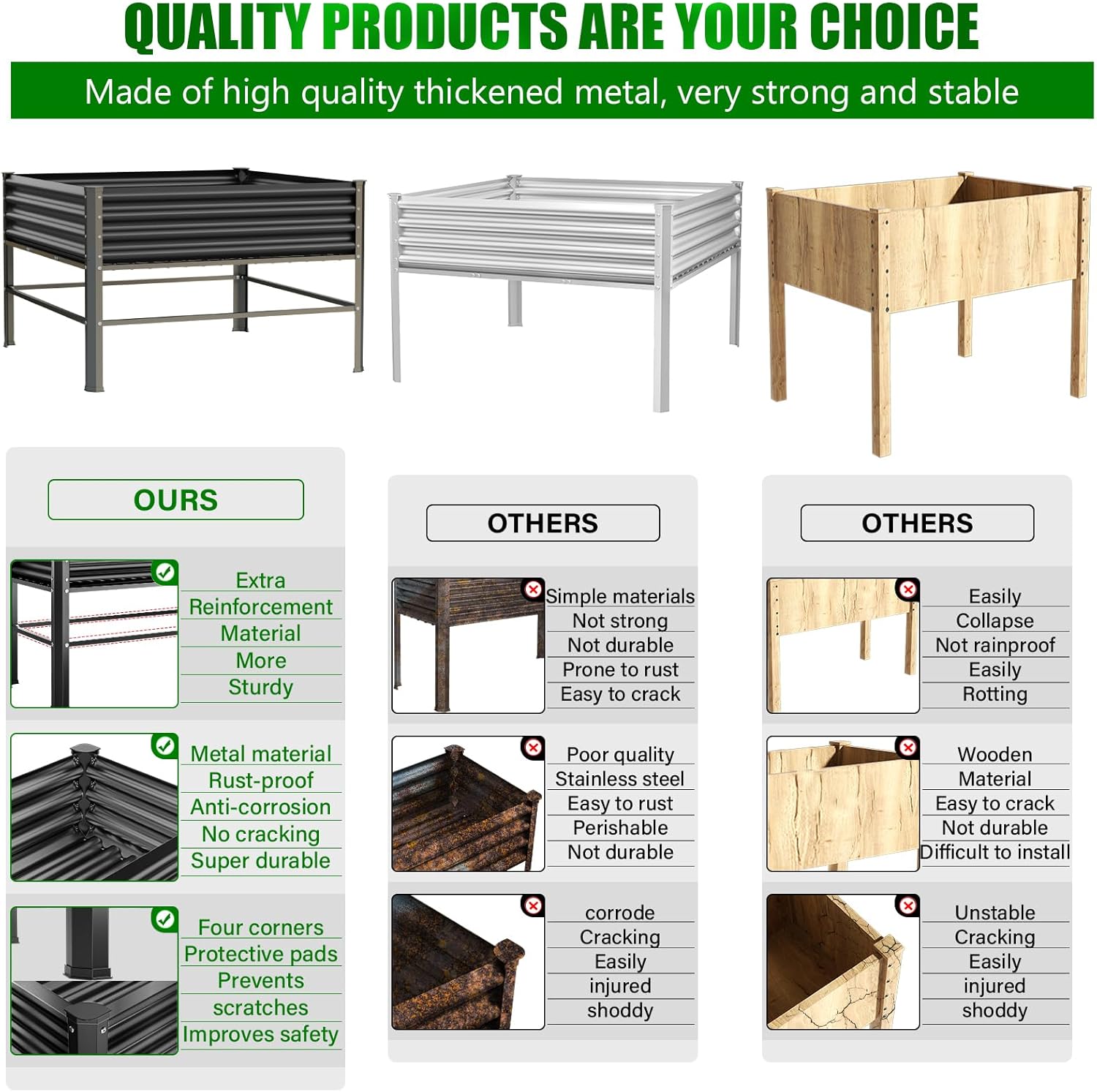 - 【Distinctive Design】-Outdoor elevated garden beds, our custom design style features galvanized sheet metal on the top, a stainless steel frame on the middle base, and the lower four corners are made of heavy-duty steel with a black powder-coated finish,This combination exceeds the lifespan of wooden products and ensures excellent rust resistance to keep the garden bed in the best condition for a long time.