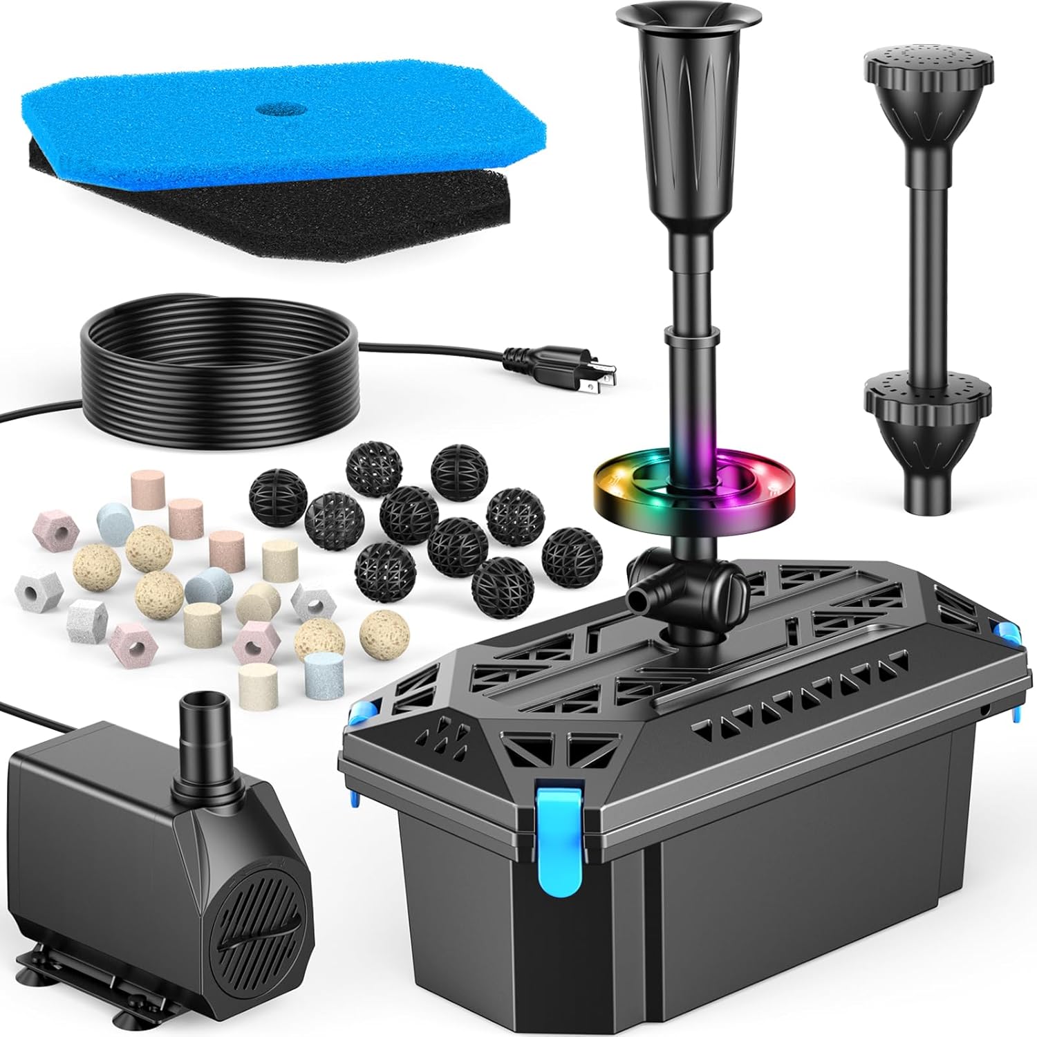 - š ćHighly Efficient Filtration SystemćThe pond pump filter for filtration, pumping, and fountains in one, which meets all the requirements of a functioning pond ecology. Multiple filtration systems (2 filter sponge /10 bio-balls /Ceramic Rings) effectively clean all types of impurities and keep the water clean. Providing a healthy environment for aquatic plants and fish growth, low energy consumption and high efficiency, durability under long-time continuous work.