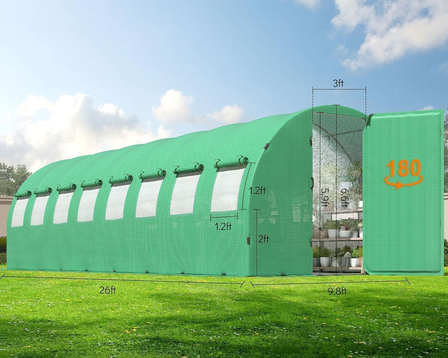 - Winter Greenhouse: Size: 26'(L) x 10'(W) x 7'(H). The arched shape encloses a large space for the tunnel greenhouse, conveniently growing and managing a variety of plants, such as vegetables, tomatoes, potatoes, herbs, plants, and flowers, also easy to be located the greenhouse for outdoors