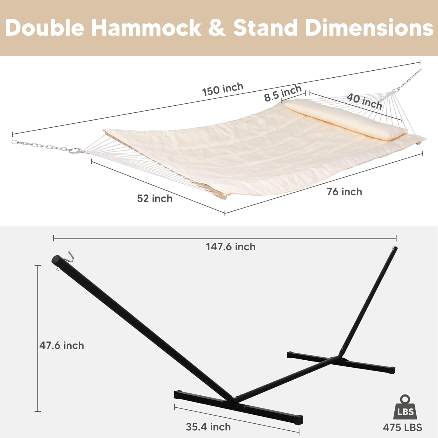 SUNCREAT Two Person Hammock with 12ft Stand Included, Max 475lbs Capacity, Heavy Duty Free Standing Hammock, Beige
