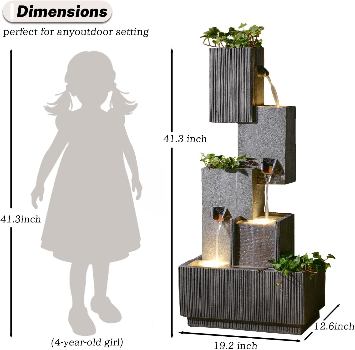 Outdoor Waterfall Fountain with LED Lights – 41.3" Tiered Resin Garden Fountain for Patio, Yard, or Backyard – Weather-Resistant Design Modern Decor