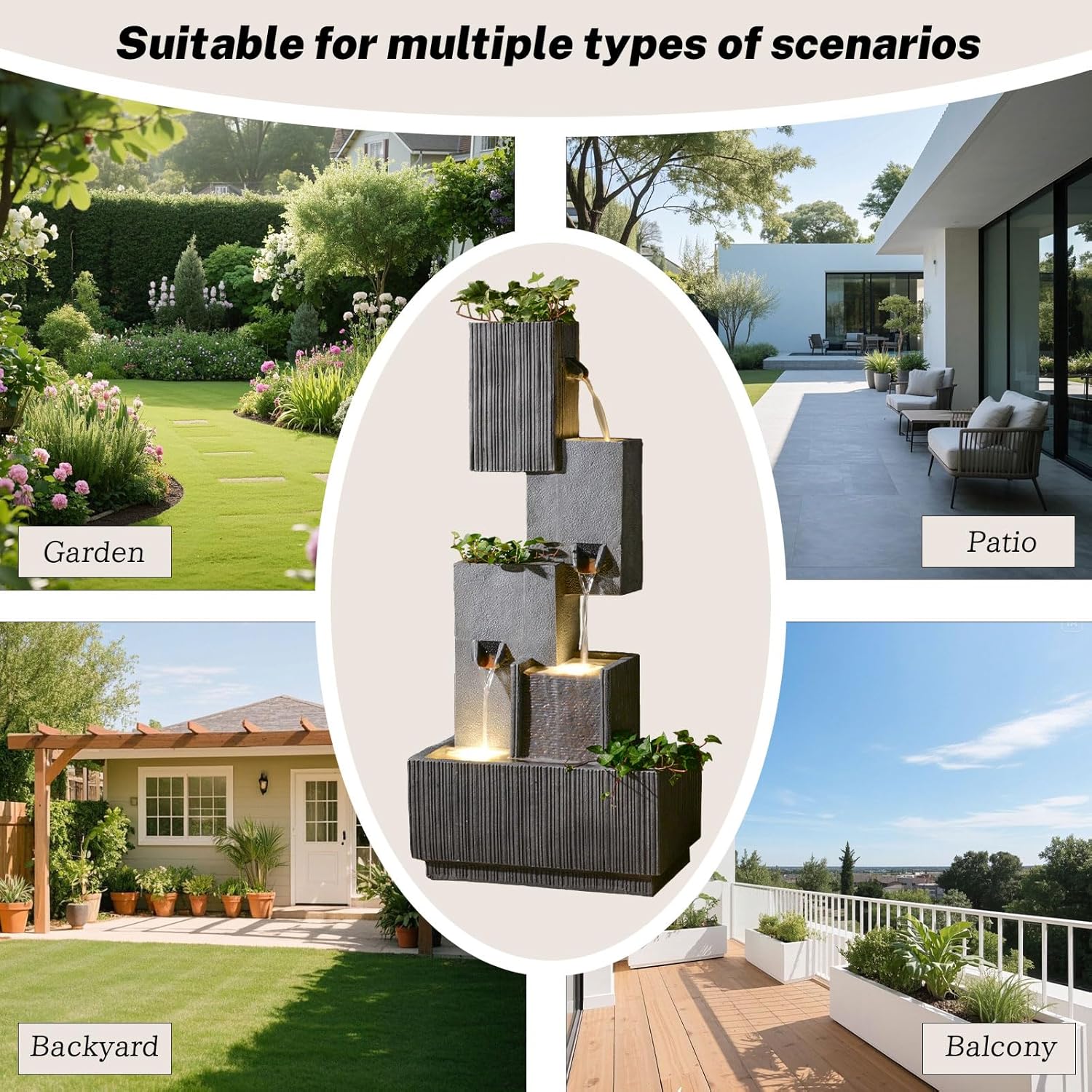 - Stunning Tiered Waterfall Design: Create a serene outdoor oasis with this elegant multi-tiered fountain, featuring a gentle cascading water flow and golden LED lights that illuminate your garden or patio at night.