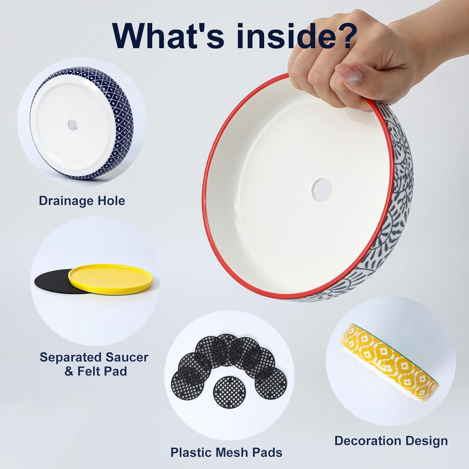 - 【CERAMIC SAUCER & MESH PADS】Each shallow planter comes with plastic mesh pad and ceramic saucer. The mesh pad keep soil from migrating out of the drainage hole and keeping it unblocked for a long time. While the matching ceramic drip saucer can collect excess water filtered from the soil without mould. These match well each other to promote your plant health growth.