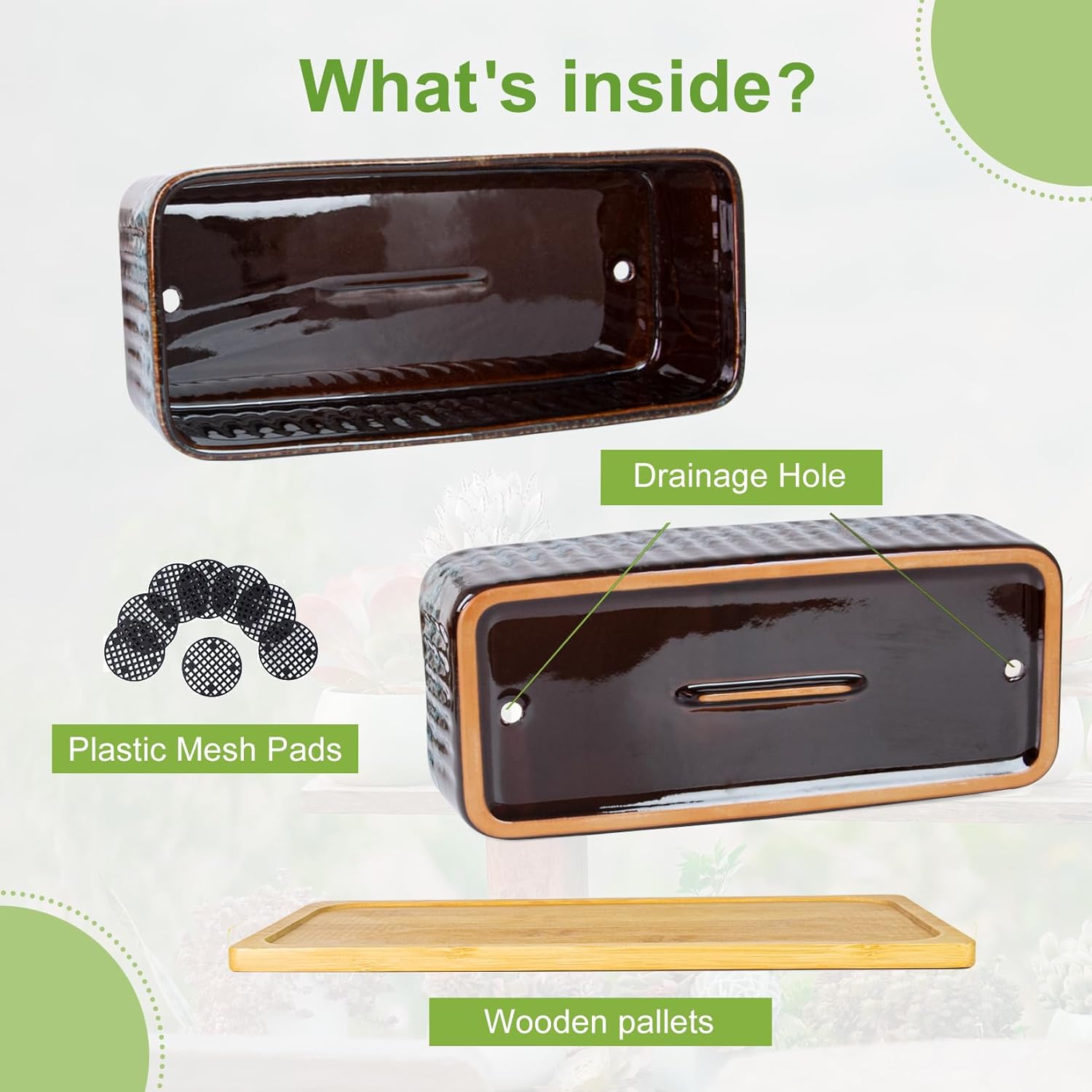- 【Dimension】The package includes a rectangle succulent planter pot with bamboo tray in perfect size: 11.8 inch(L)*4.72 inch(W)* 3.07 inch(H). For any quality problems, please feel free to let us know. Artketty will never disappoint any customer.(PLANTS NOT INCLUDED)