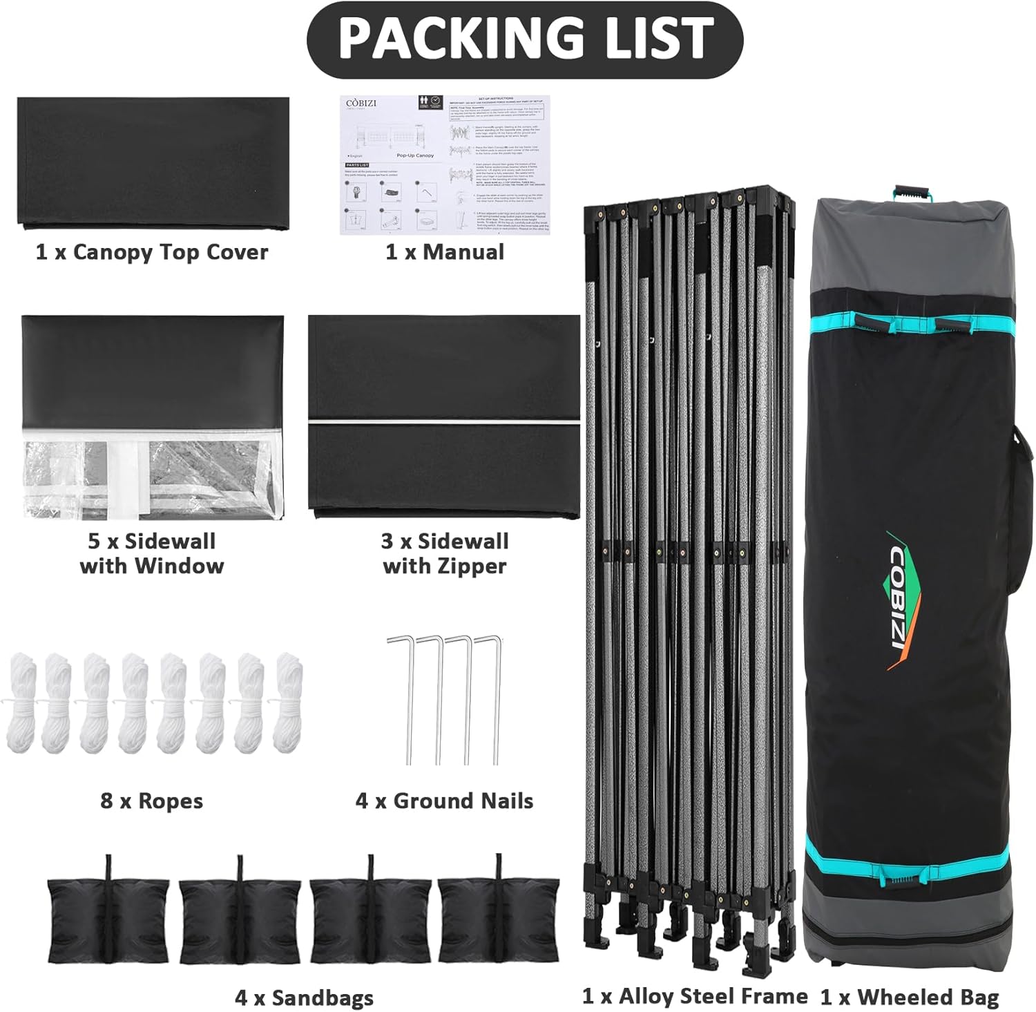 - 【Wheeled Storage Bag】10x30 canopy wheeled roller bag size is 164x66x24cm (64.6x26.0x9.4inch), 600D Oxford Cloth fabric. Storage bag with 4 wheels on the bottom for easy transport. 3 handle on the side for 2 people to lift. 1 handle on the top for 1 people to glide. The Package Includes: Pop up Canopy Frame x 1Pcs + 10′x30′ Canopy Tent Top Cover x 1Pcs + Sidewall with Zipper x 3Pcs + Sidewall with Window x 5Pcs + Sandbag x 4Pcs + Ground Nails x 4Pcs + Ropes x 8Pcs + Wheeled Storage Bag x 1Pcs.