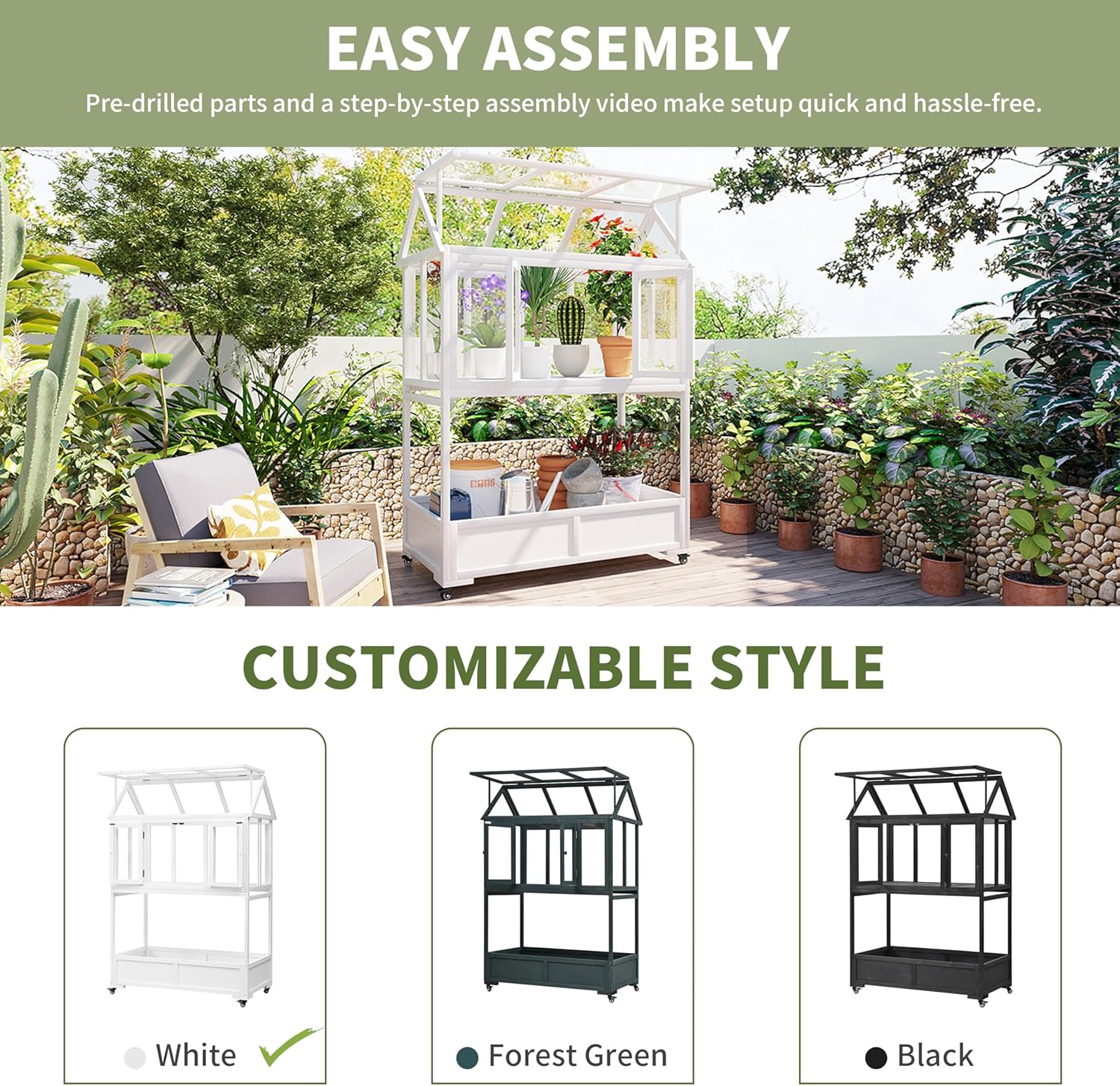 Garden Wood Portable Cold Frame - Mini Greenhouse with Wheels, Open Roof & Storage (White + Beige + Beige)