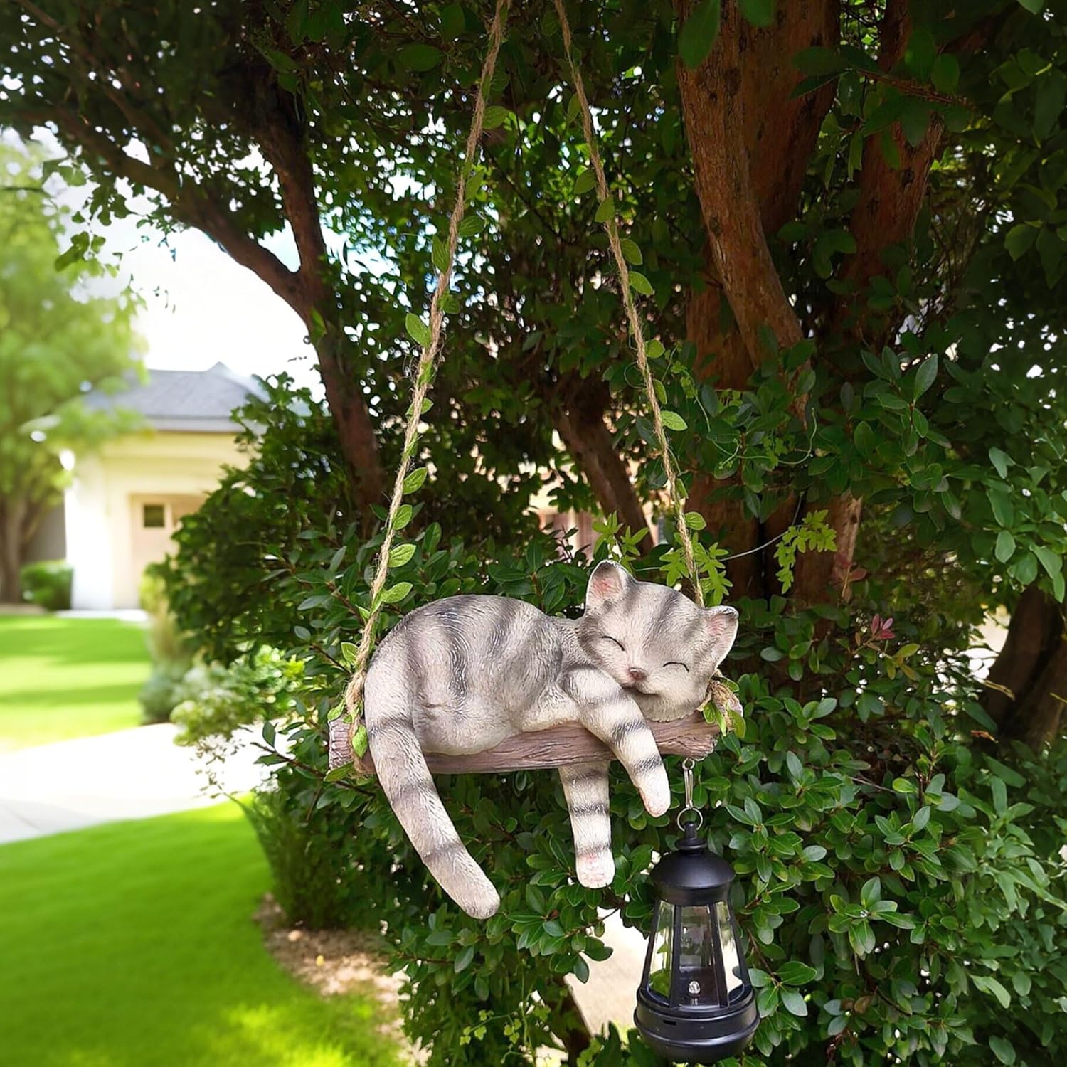 - CHARMING CAT ON SWING: Crafted from premium resin material, this exquisite figurine features an adorable cat napping peacefully on a vine-and-wood swing. Hand-painted with lifelike details and fade-resistant coatings, it retains its vibrant colors even under harsh weather conditions. With an IP44 waterproof rating, it's built to last indoors and outdoors.