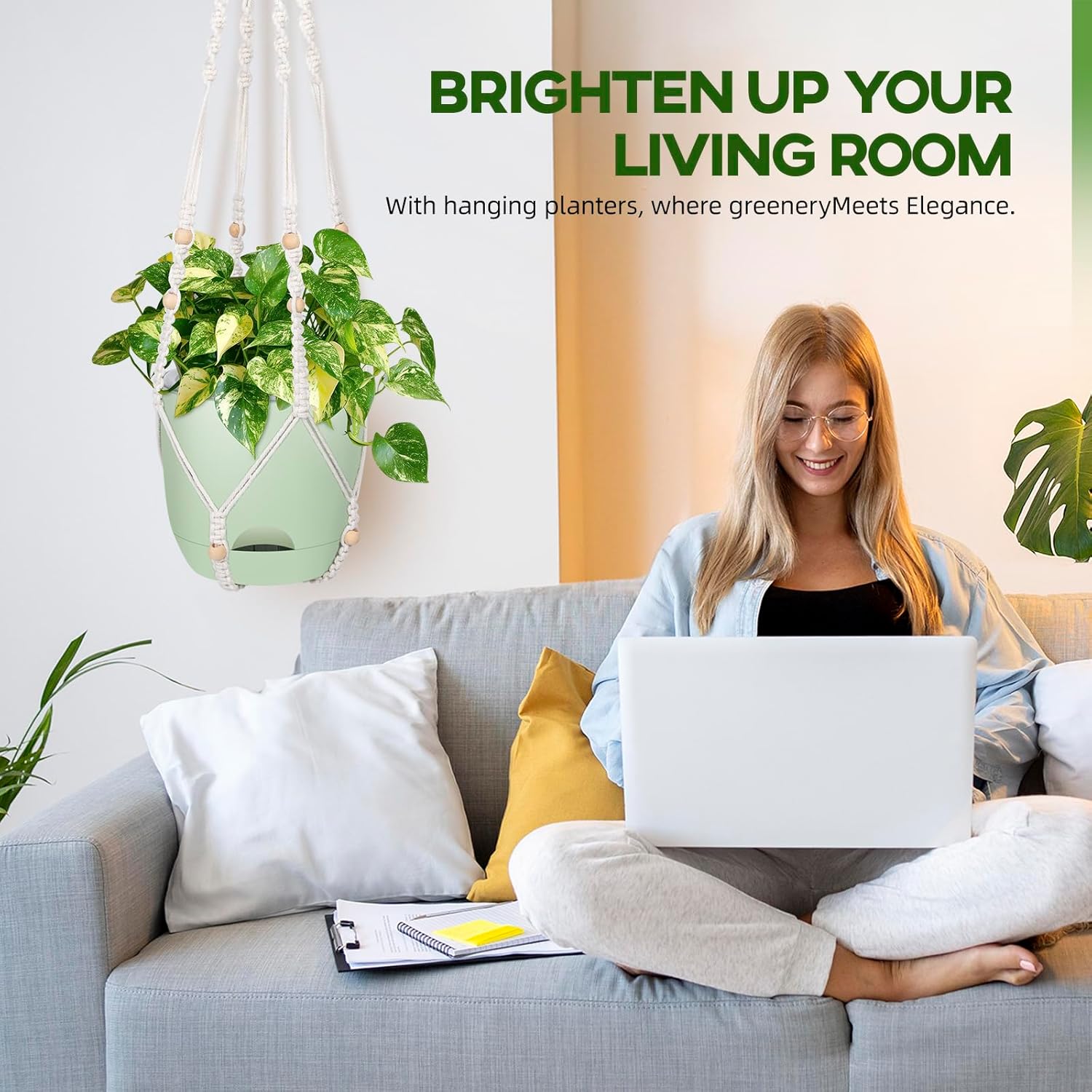 2-Pack 7..1-Inch Self-Watering Hanging Planters for Indoor & Outdoor Plants,34Inch Macrame Hanger Plant Pots Indoor with Drainage,Small Hanging Planters & Baskets,With Two Sets of Hooks(Pure green)