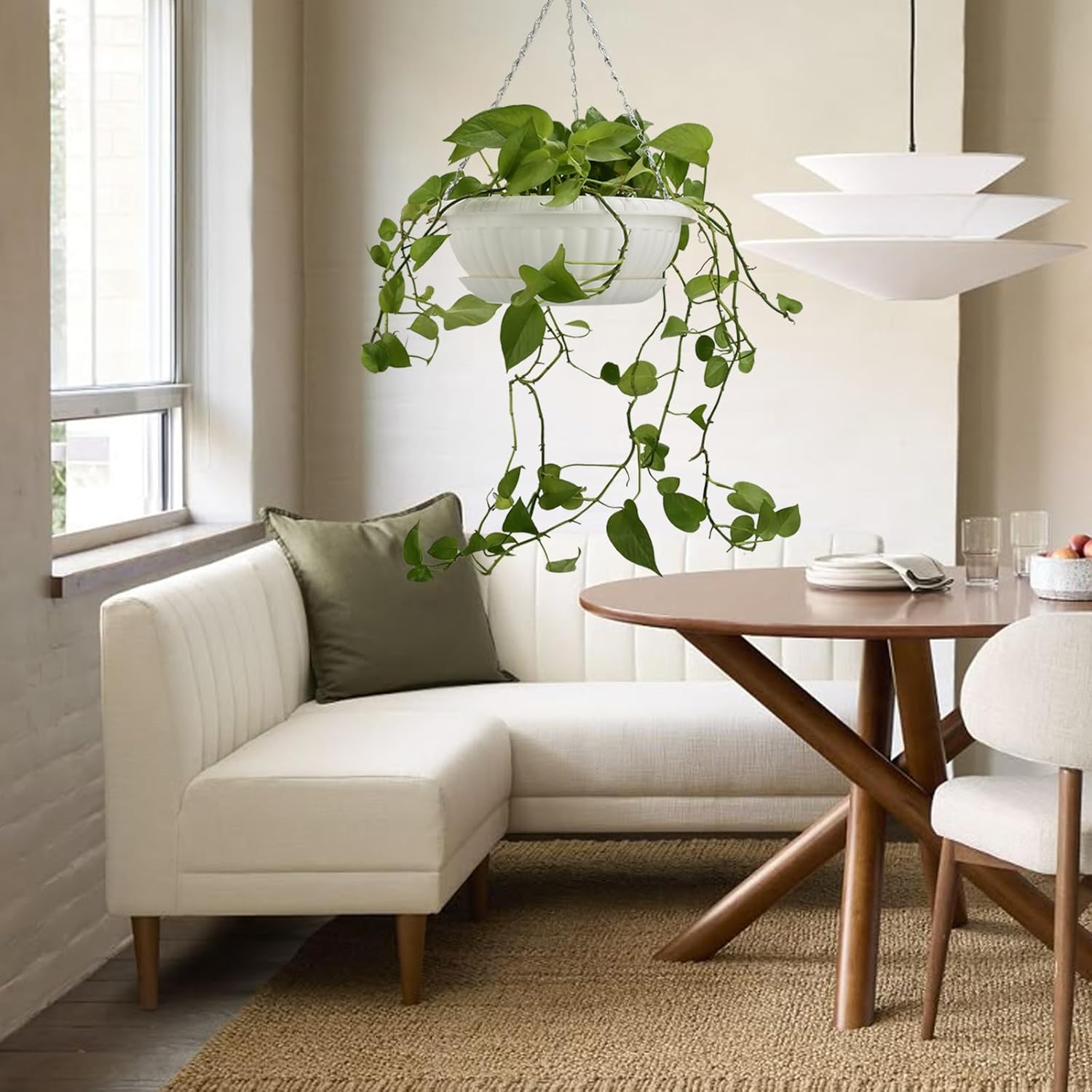 - Plant baskets are made of high quality plastic, light-weight. Coated metal chain, not easy to rust.
