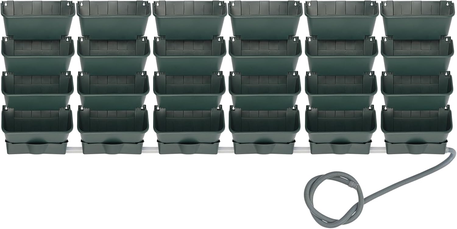 Vertical Wall Planter with 24 Pots, Hanging Garden Plant Flowerpot Holder, Stackable Wall-Mounted Planter, Balcony Planters for Flowers Vegetables Fruits (Army Green, 24 Pots+6 Drainage Planters&Pipe)