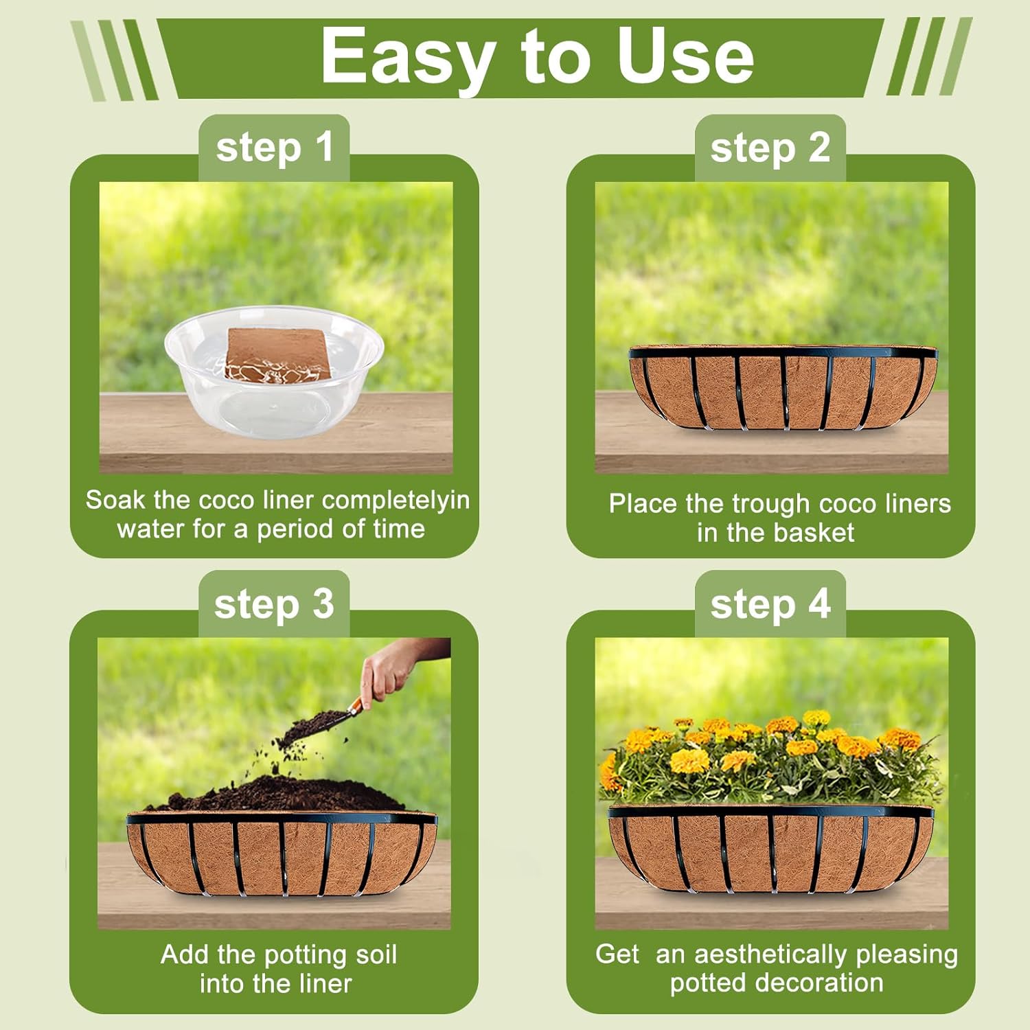 - Eco-Friendly and Biodegradable: Our coconut liners for planters are not only non-toxic and odorless but also biodegradable, making them a sustainable choice for environmentally-conscious gardeners. Transform your outdoor and indoor spaces into a lush, vibrant oasis with our premium coconut coir liners.