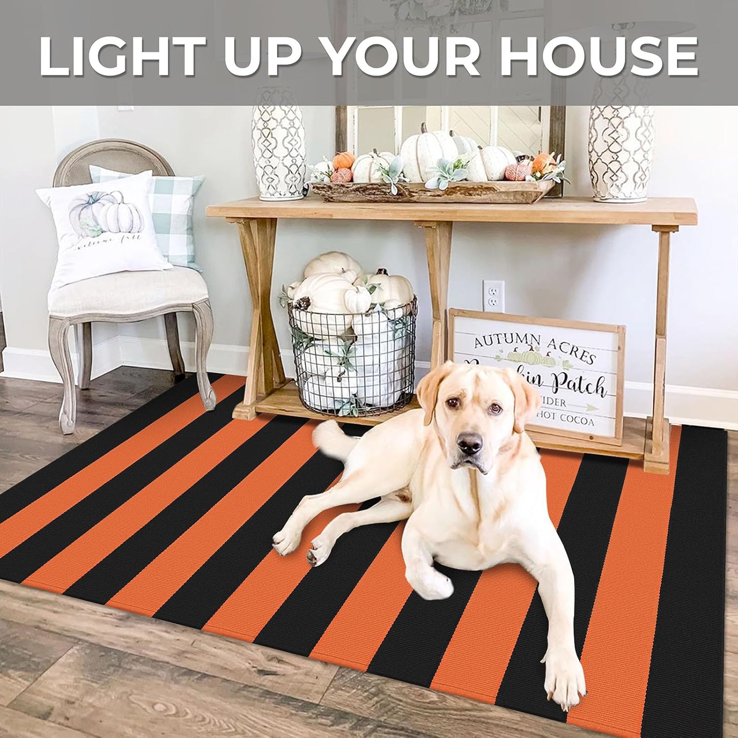 - Easy to Clean: This orange and black striped rug is simple to maintain with machine wash or vacuuming to remove dirt. The rug is sturdy and can be tumble dried on low. Keep your door rug fresh and clean with minimal effort. NOTE: Cotton rugs normally shrink slightly after washing