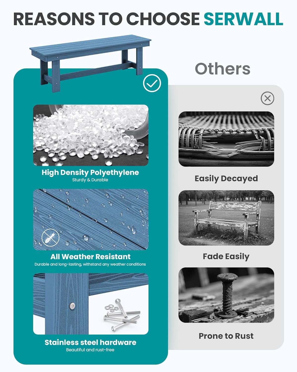 - All-Weather Resistant: The SERWALL garden bench is made of durable high-density polyethylene (HDPE), along with 304 stainless steel hardware, making it resistant to various weather conditions and ensuring long-lasting durability. It is an ideal choice for any outdoor environment.