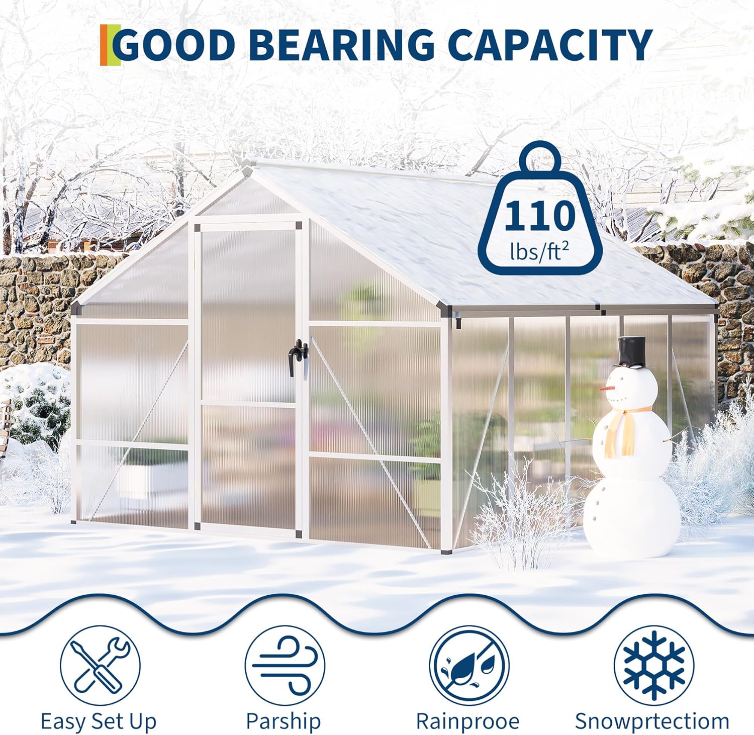 - 【Study Build】Crafted to handle various weather conditions, this greenhouse uses 720g/m² polycarbonate panels and a robust aluminum frame for enhanced durability. The strong structure offers reliable performance in heavy rain and strong wind, helping to maintain a safe environment for your plants in different seasons