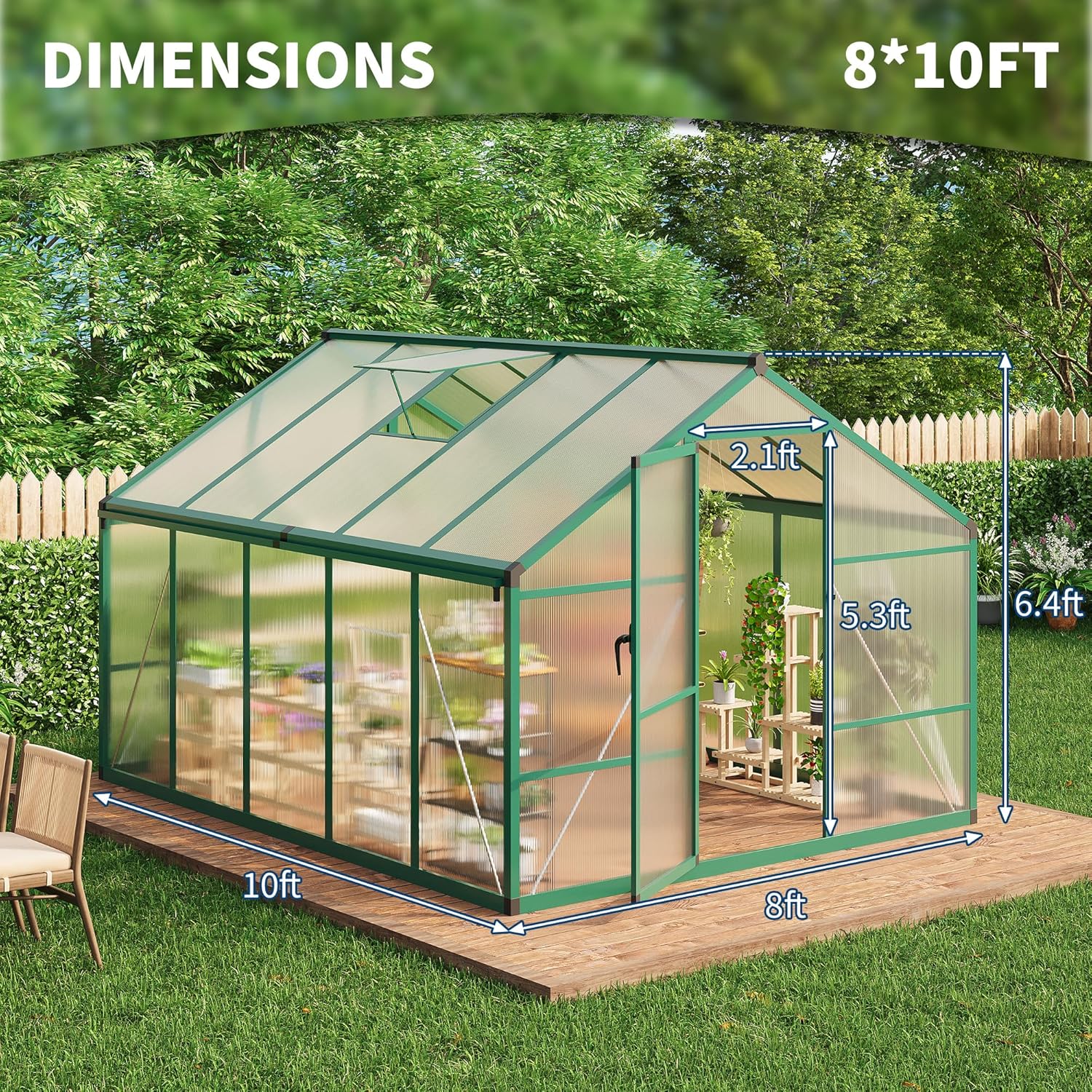 8x10 FT Greenhouse for Outdoors, Polycarbonate Flower Greenhouse with Roof Vent, Push-Pull Lockable Door, Aluminum Walk-in Greenhouses for Outside Garden Backyard, Patio, Lawn, Green