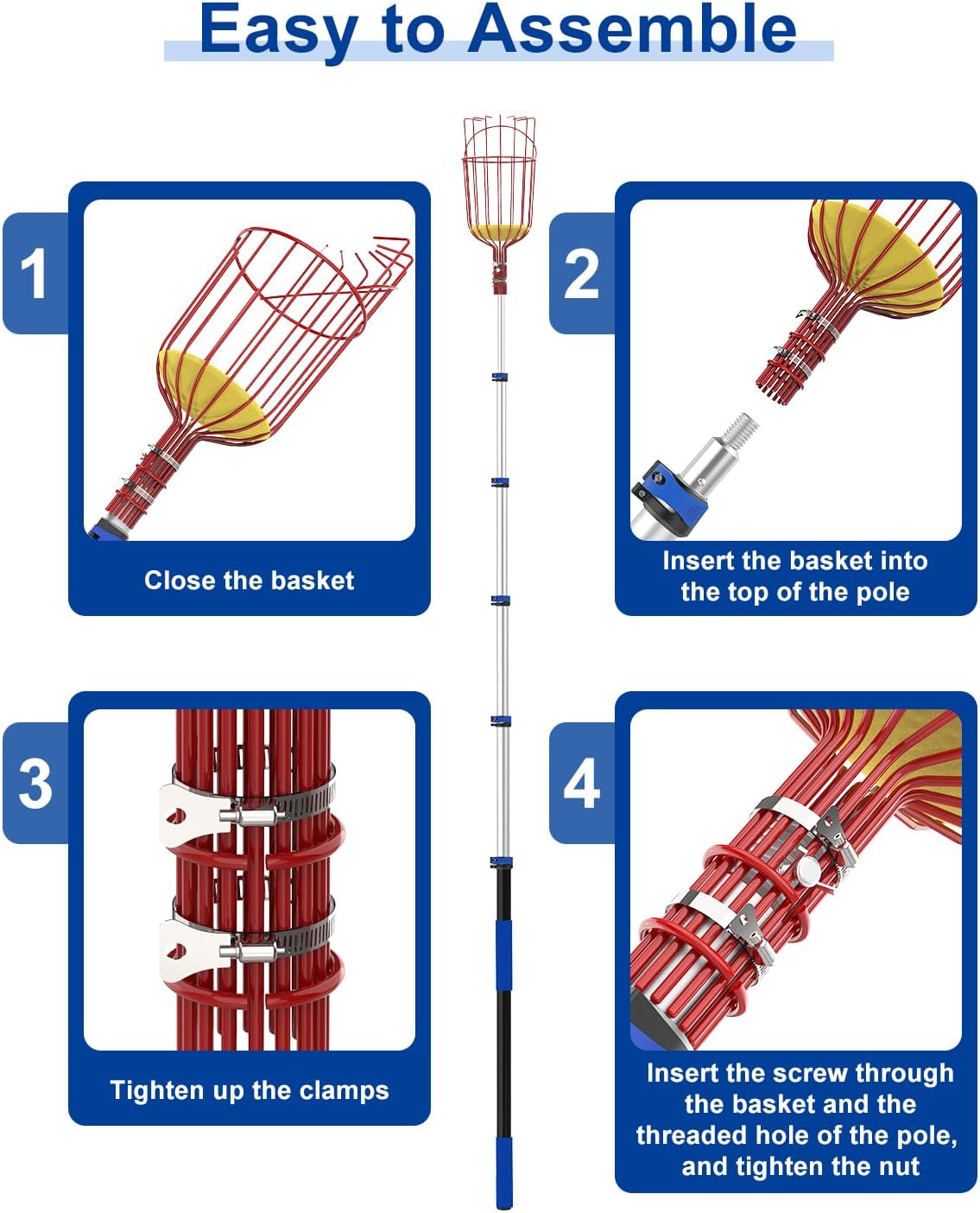 - Easy to Install - This fruit picker only requires a few simple installation steps. Firstly, fix the fruit basket to the pole with a metal clip, then thread the long screw through the hole on the pole and the fruit basket, and finally secure it with a nut. Without the need for additional tools, the fruit picking basket can be easily and firmly fixed to the extension rod.