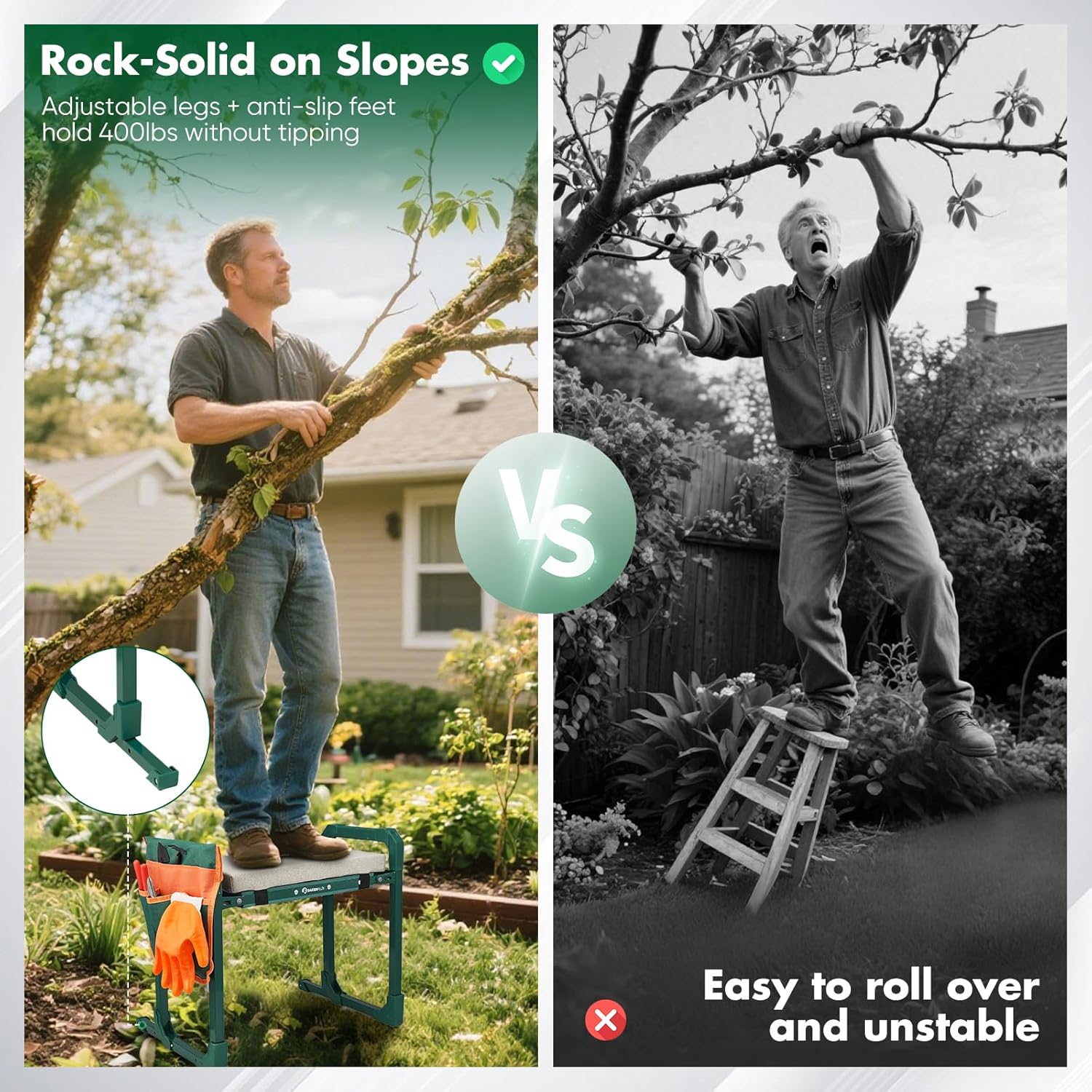 - ⚙ 【Adjustable Legs for Uneven Terrain】 Built with extendable support legs and non-slip rubber feet, this Sakerplus kneeling chair adapts to slopes, gravel, or soft soil. Designed to help maintain stability while planting in raised beds or trimming hedges, even on uneven ground.