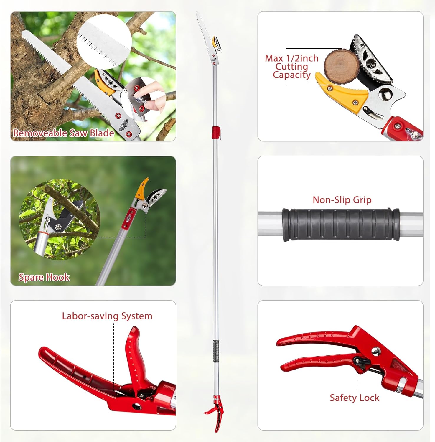 - Removable Saw Blade & Spare Hook: Perfect for tree trimmers, this tool features a quick-release saw blade for effortless swaps and includes an spare hook for uninterrupted work. Handles branches up to 1/2 inch thick with precision cutting power