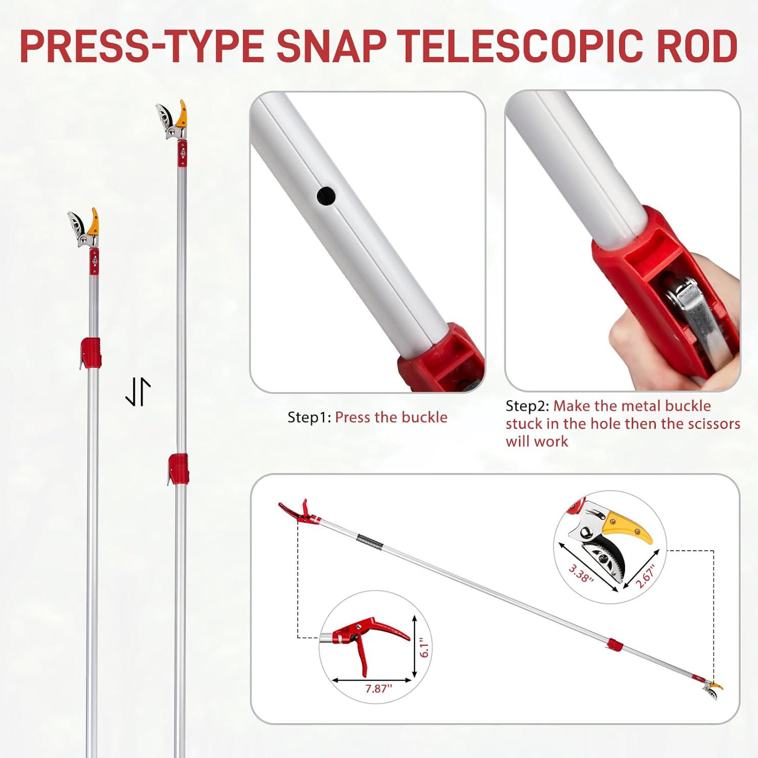 - Press-Type Snap Telescopic Rod: Adjustable length with a simple buckle mechanism (press to lock/unlock). Offers multiple size options (4.39' to 7.22') to suit different pruning needs, extending up to 7.22ft for hard-to-reach branches. Step1: Press the buckle. Step2: Make the metal buckle stuck in the hole then the scissors will work