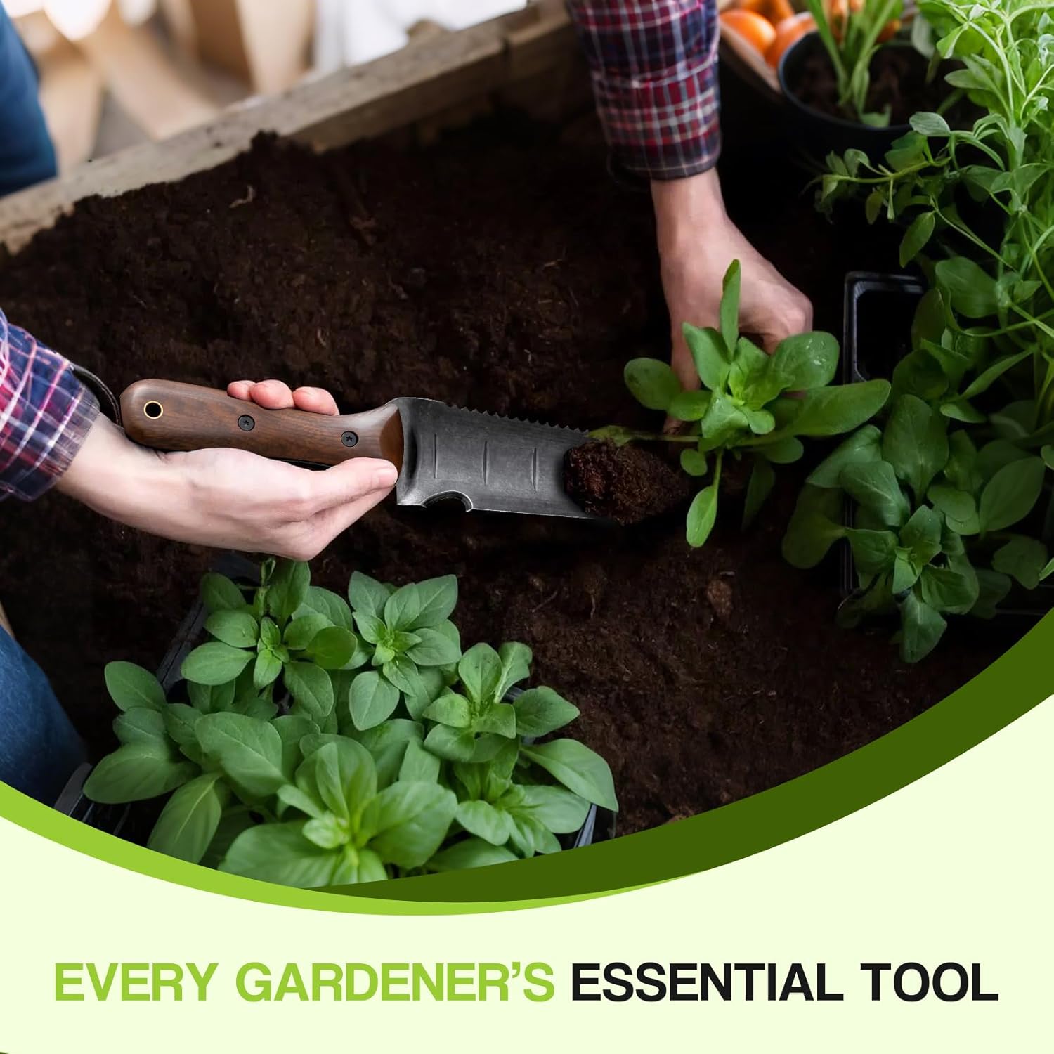 - MULTIFUNCTION BLADE GARDEN KNIFE: This garden knife is equipped with a sharp straight edge and a serrated edge. The straight edge is ideal for daily cutting, while the serrated edge can easily handle tough roots and stems. The blade is marked with inch measurements, enabling precise control of planting depth. The cord-cutting edge can also double as a bottle opener. With its walnut wood handle and practical blade, it is a reliable tool for both outdoor activities and gardening work